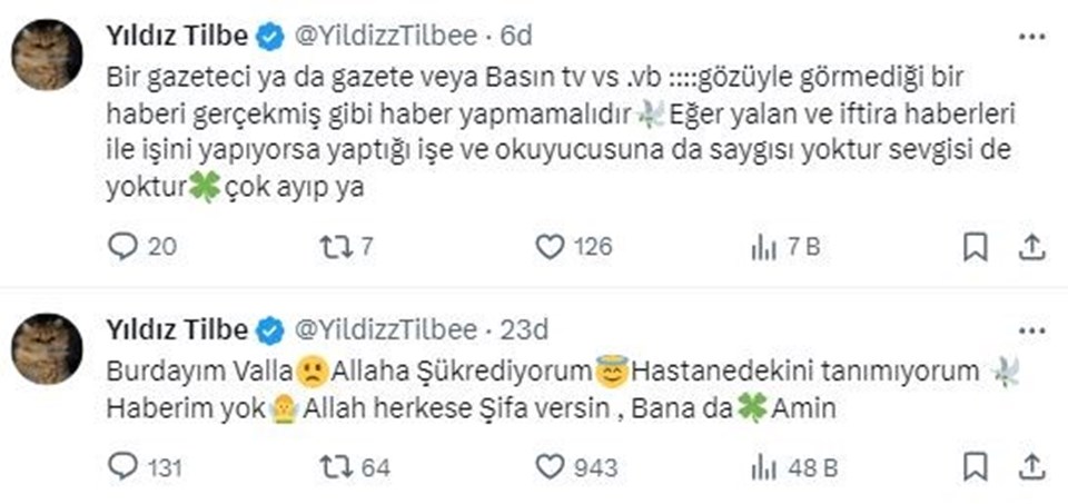 Yıldız Tilbe’nin yoğun bakıma kaldırıldığı haberleri sevenlerini endişelendirmişti. Haberlerin kısa sürede yayılması ardından sosyal medya hesaplarından açıklama yapan Tilbe, yoğun bakım ha...