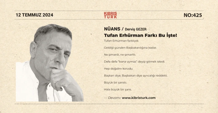 Tufan Erhürman farklıydı. Geldiği günden Başbakanlığına kadar. Ne şımardı, ne şımarttı. Defa defa “bana uymaz” deyip gitmek istedi. Hep doğalını korudu. Başkan diye, Başbakan diye ayrıcalığı reddetti....