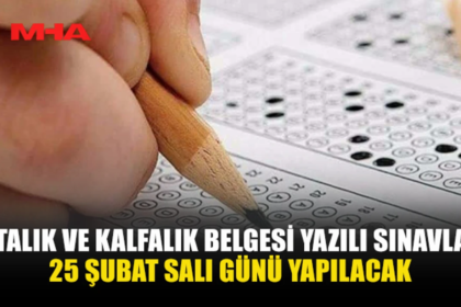 Ustalık ve Kalfalık Belgesi Yazılı Sınavları, 25 Şubat Salı günü saat 14.00’te Osman Örek Meslek Lisesi’nde yapılacak. Bakanlıktan yapılan açıklamaya göre, yazılı sınava katılmak isteyen a...