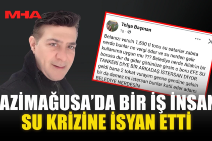 Ergün Yahat Gazimağusa’da son günlerde yaşanan su sıkıntısı vatandaşların tepkisine neden olurken, su fiyatlarındaki artış kamuoyunda tartışma yarattı. Bazı su dağıtıcılarının ton başına 1.500 TL tale...