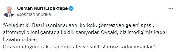 Sosyal medyayı aktif kullanan siyasilerin başında gelen AK Parti İstanbul İl Başkanı Osman Nuri Kabaktepe, dikkat çeken bir paylaşıma imza attı. 31 Mart yerel seçimleri sonrası istifası istendiği konu...