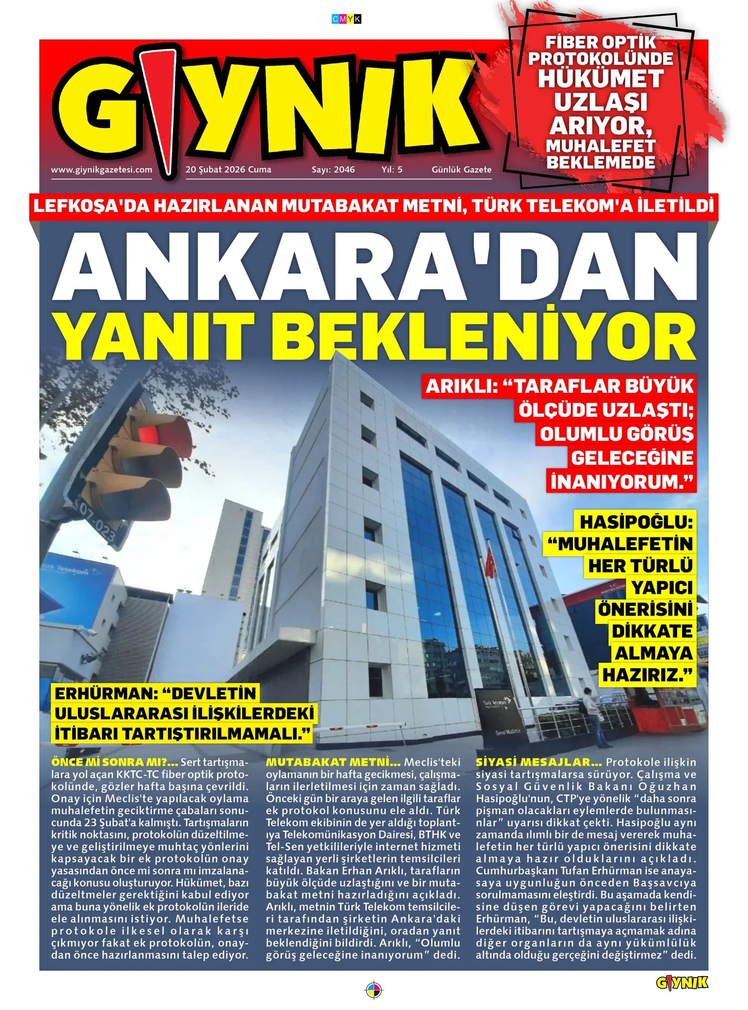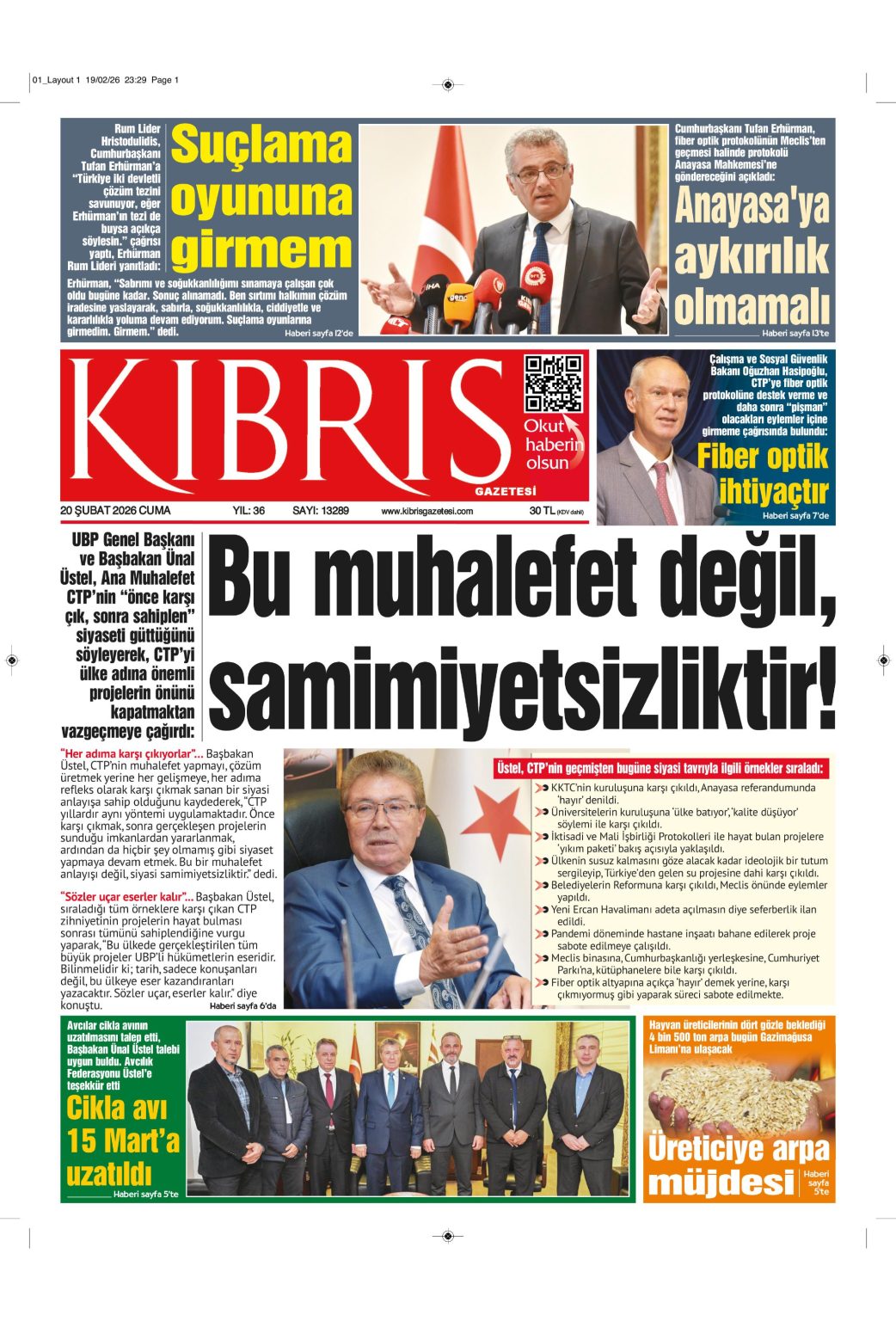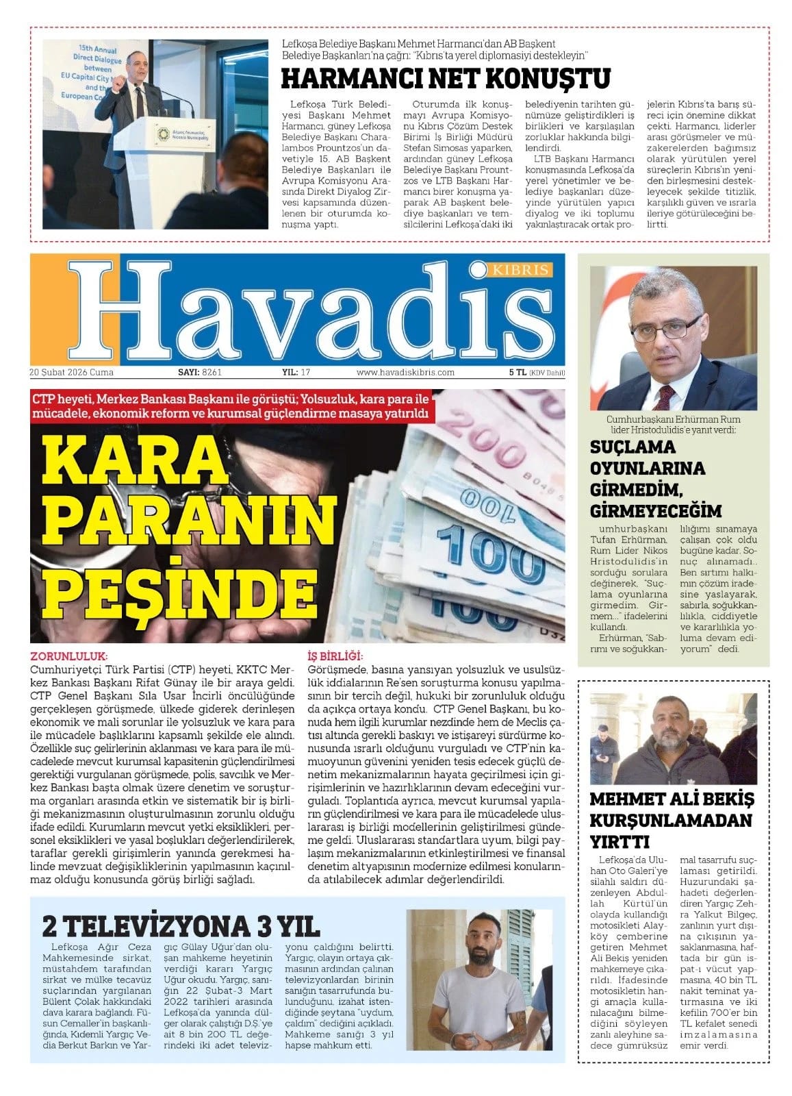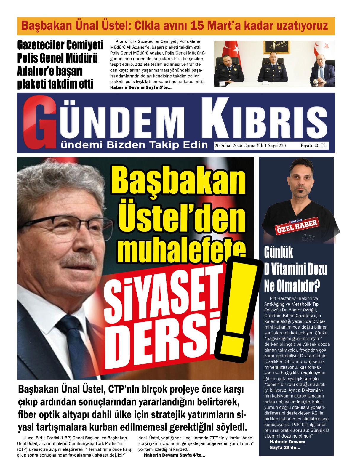 GündemKıbrısManşetGAZETE MANŞETLERİ (20 ŞUBAT 2026)Şubat 20, 2026 8:21 am PaylaşEtiketlendi:Kibris dakik KKTC gazeteleri manşetleri İlgili haberler 19 ŞUBAT KKTC GAZETE MANŞETLERİ Şubat 19, 2026 GAZETE MANŞETLERİ (17 ŞUBAT 2026) Şubat 17, 2026 GAZETE MANŞETLERİ (14 ŞUBAT 2026) GÖRSELLERİ YAKINLAŞTIRMA YAPAB ... Şubat 14, 2026 Cevap bırakın Yanıtı iptal etE-posta adresiniz yayınlanmayacak. Gerekli alanlar * ile işaretlenmişlerdirYorumAd * E-posta * İnternet sitesi Daha sonraki yorumlarımda kullanılması için adım, e-posta adresim ve site adresim bu tarayıcıya kaydedilsin.