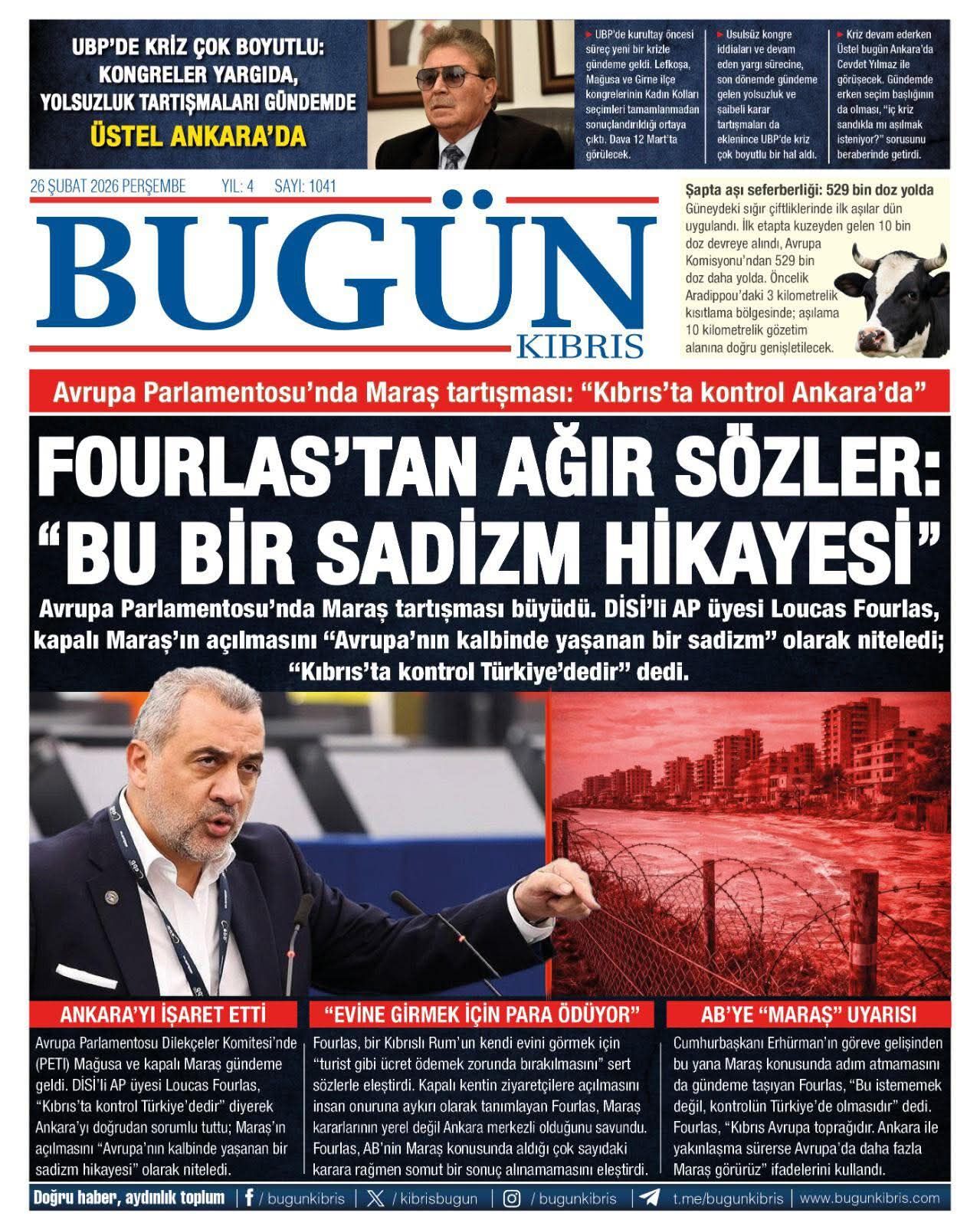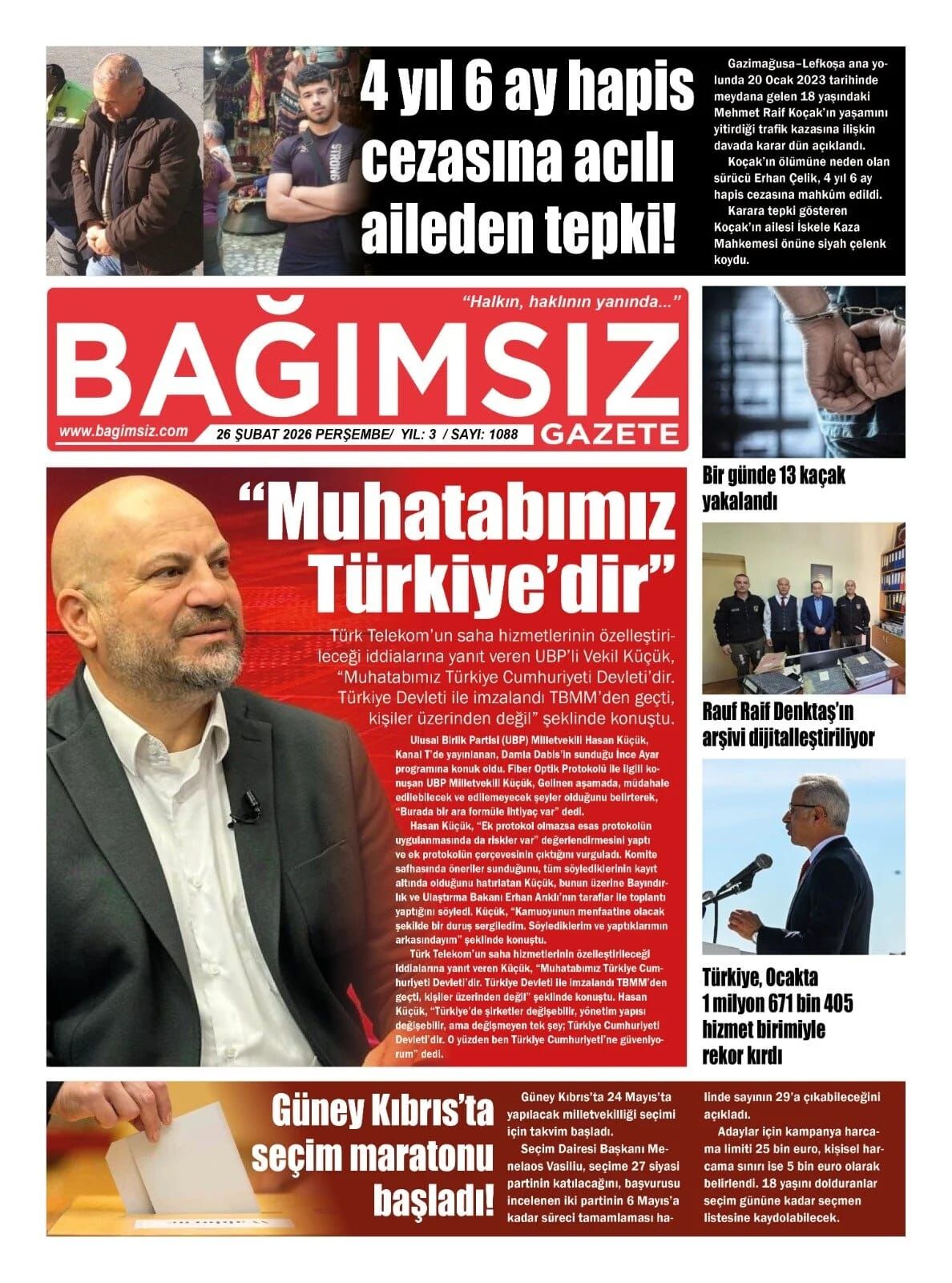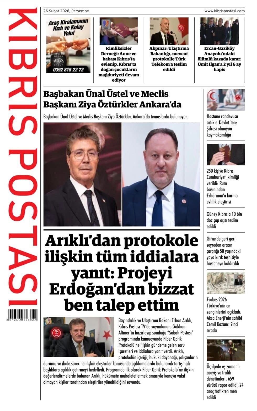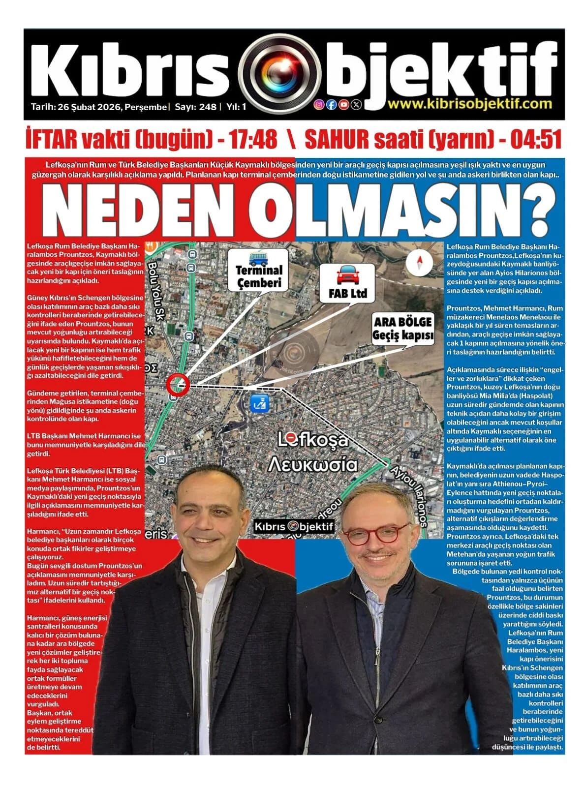 GündemKıbrısManşetGAZETE MANŞETLERİ (26 ŞUBAT 2026)Şubat 26, 2026 8:25 am PaylaşEtiketlendi:Kibrisdakik.com KKTC Gazete Manşetleri 5 Kasım 2025 İlgili haberler GAZETE MANŞETLERİ (24 ŞUBAT 2026) Şubat 24, 2026 19 ŞUBAT KKTC GAZETE MANŞETLERİ Şubat 19, 2026 GAZETE MANŞETLERİ (17 ŞUBAT 2026) Şubat 17, 2026 Cevap bırakın Yanıtı iptal etE-posta adresiniz yayınlanmayacak. Gerekli alanlar * ile işaretlenmişlerdirYorumAd * E-posta * İnternet sitesi Daha sonraki yorumlarımda kullanılması için adım, e-posta adresim ve site adresim bu tarayıcıya kaydedilsin.