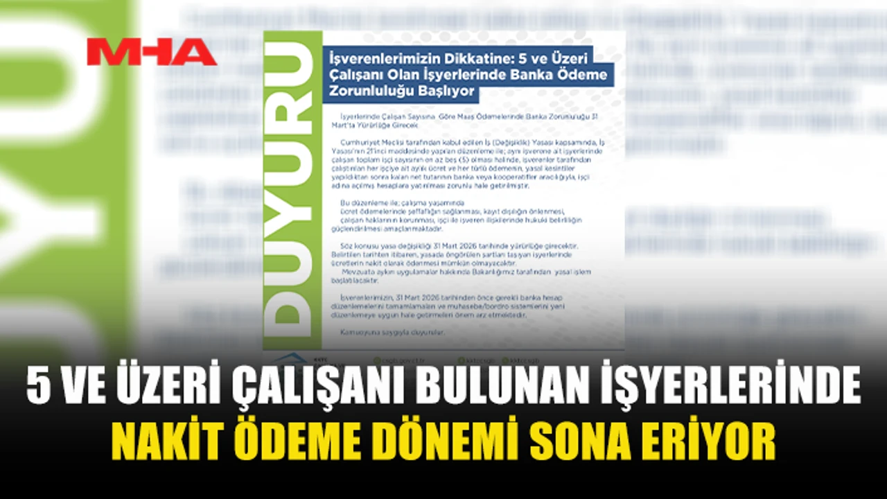Çalışma ve Sosyal Güvenlik Bakanlığı, 5 ve üzeri çalışanı bulunan işyerlerinde maaşların banka veya kooperatif aracılığıyla ödenmesini zorunlu kılan yasal düzenlemeye ilişkin kamuoyuna duyuru yaptı. Bakanlık açıklamasında, düzenlemenin 31 Mart 2026 tarihinde yürürlüğe gireceği hatırlatıldı.