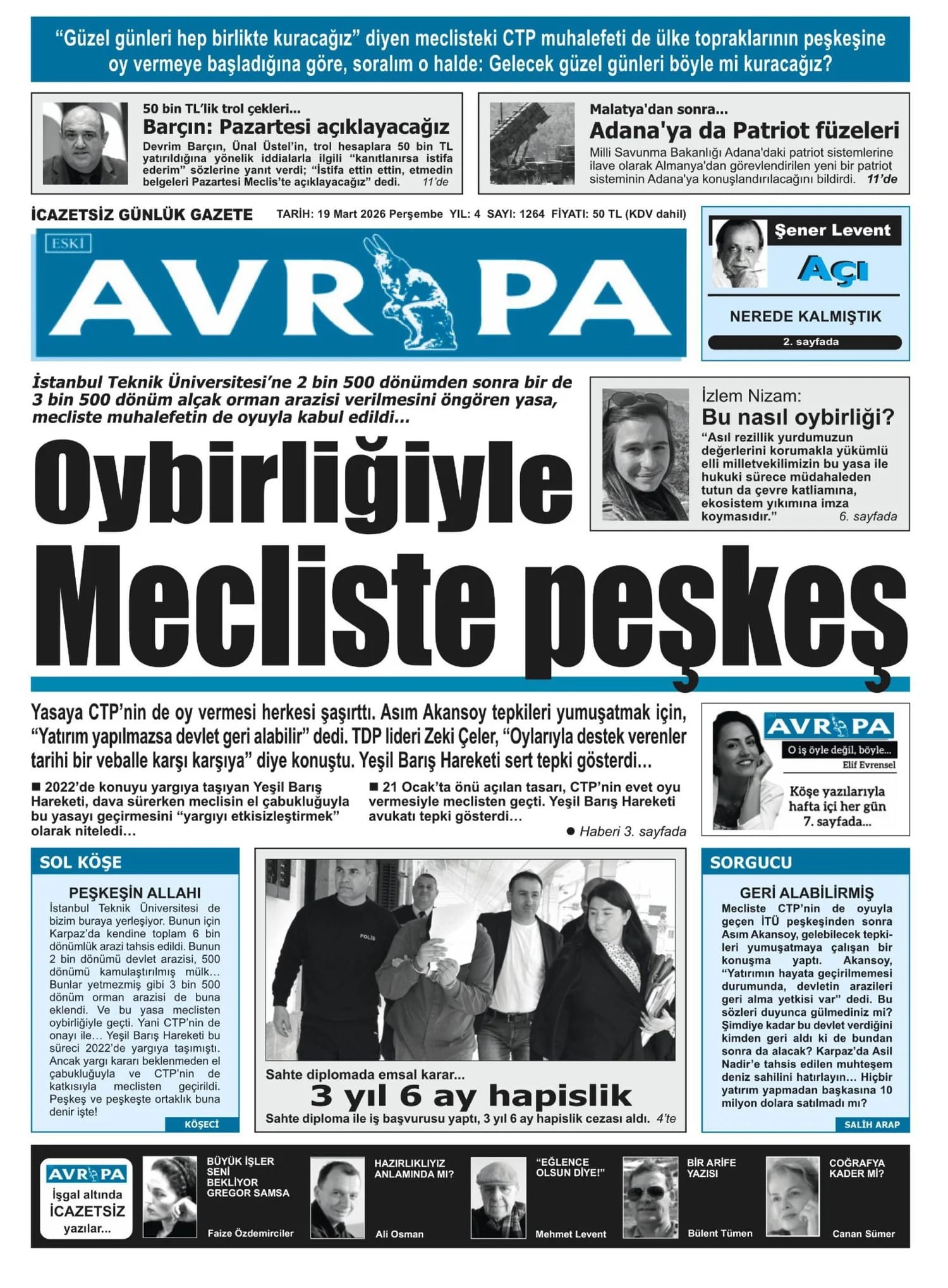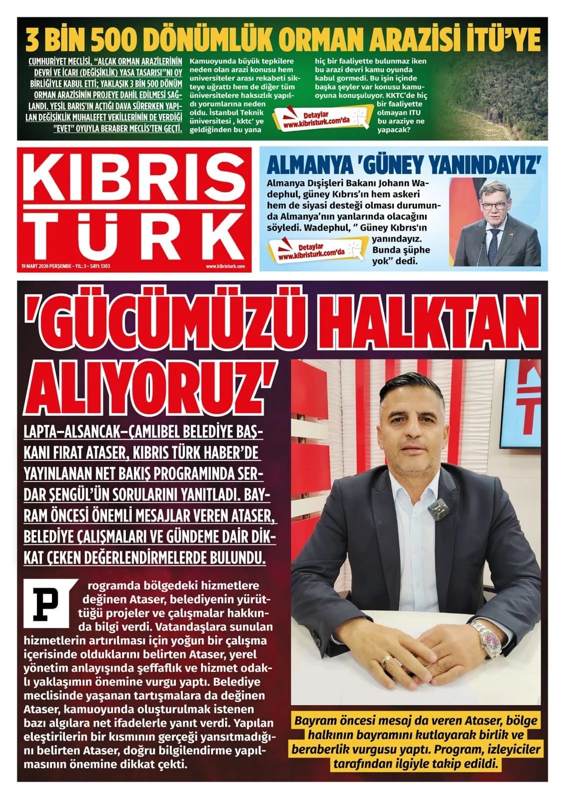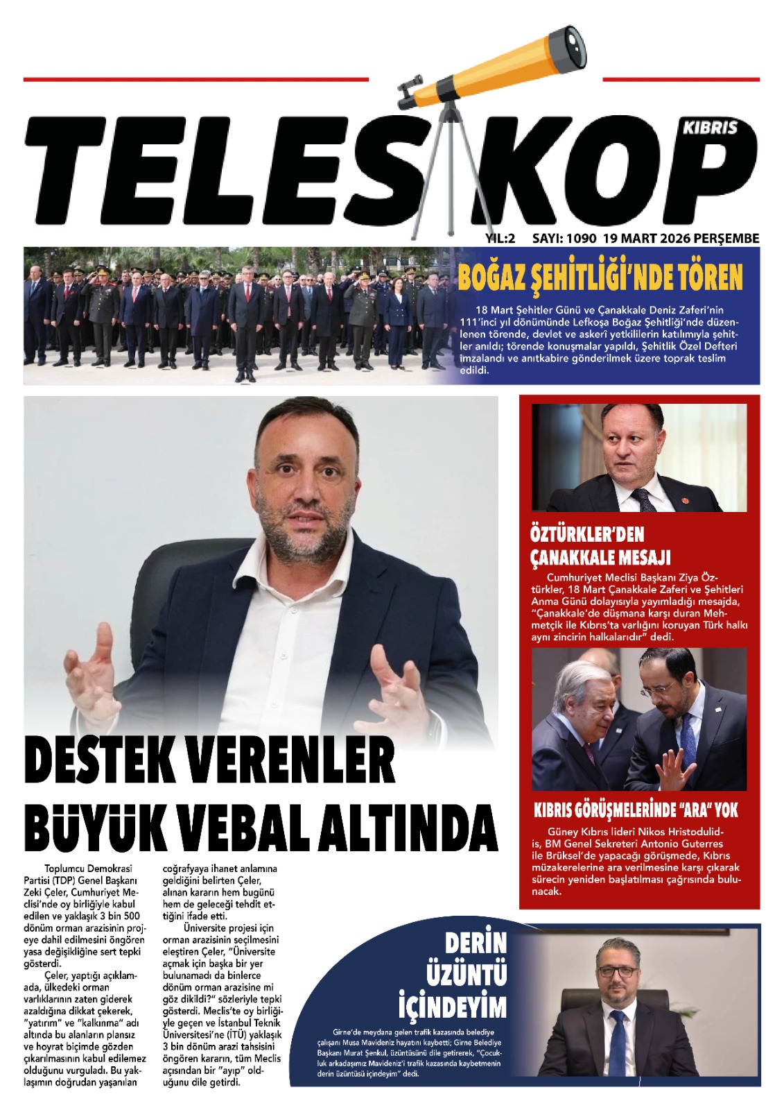 KıbrısManşetTürkiye19 MART GAZETE MANŞETLERİMart 19, 2026 9:05 am PaylaşEtiketlendi:19 MART GAZETE MANŞETLERİ İlgili haberler İŞLETME SAHİBİ TRAJE ULUEL KONCAOĞLU’NDAN AÇIKLAMA Mart 23, 2026 KAZADA YARALANMIŞTI 13 GÜN DİRENDİ, YAŞAM SAVAŞINI KAYBETTİ Mart 23, 2026 ATAHAN AKÇAM'DAN GURULANDIRAN BAŞARI Mart 23, 2026 Cevap bırakın Yanıtı iptal etE-posta adresiniz yayınlanmayacak. Gerekli alanlar * ile işaretlenmişlerdirYorumAd * E-posta * İnternet sitesi Daha sonraki yorumlarımda kullanılması için adım, e-posta adresim ve site adresim bu tarayıcıya kaydedilsin.