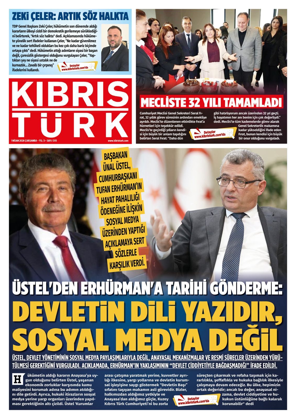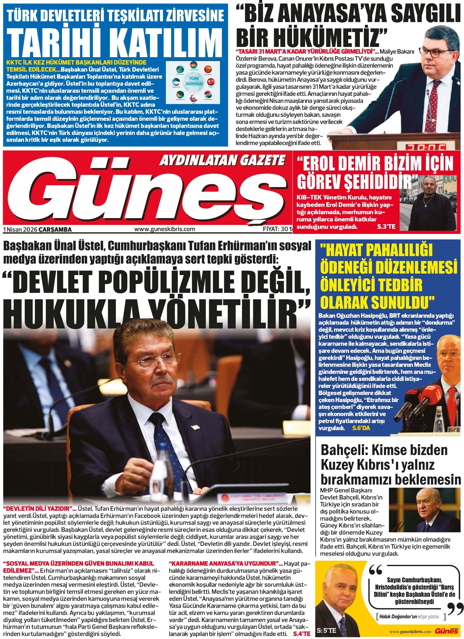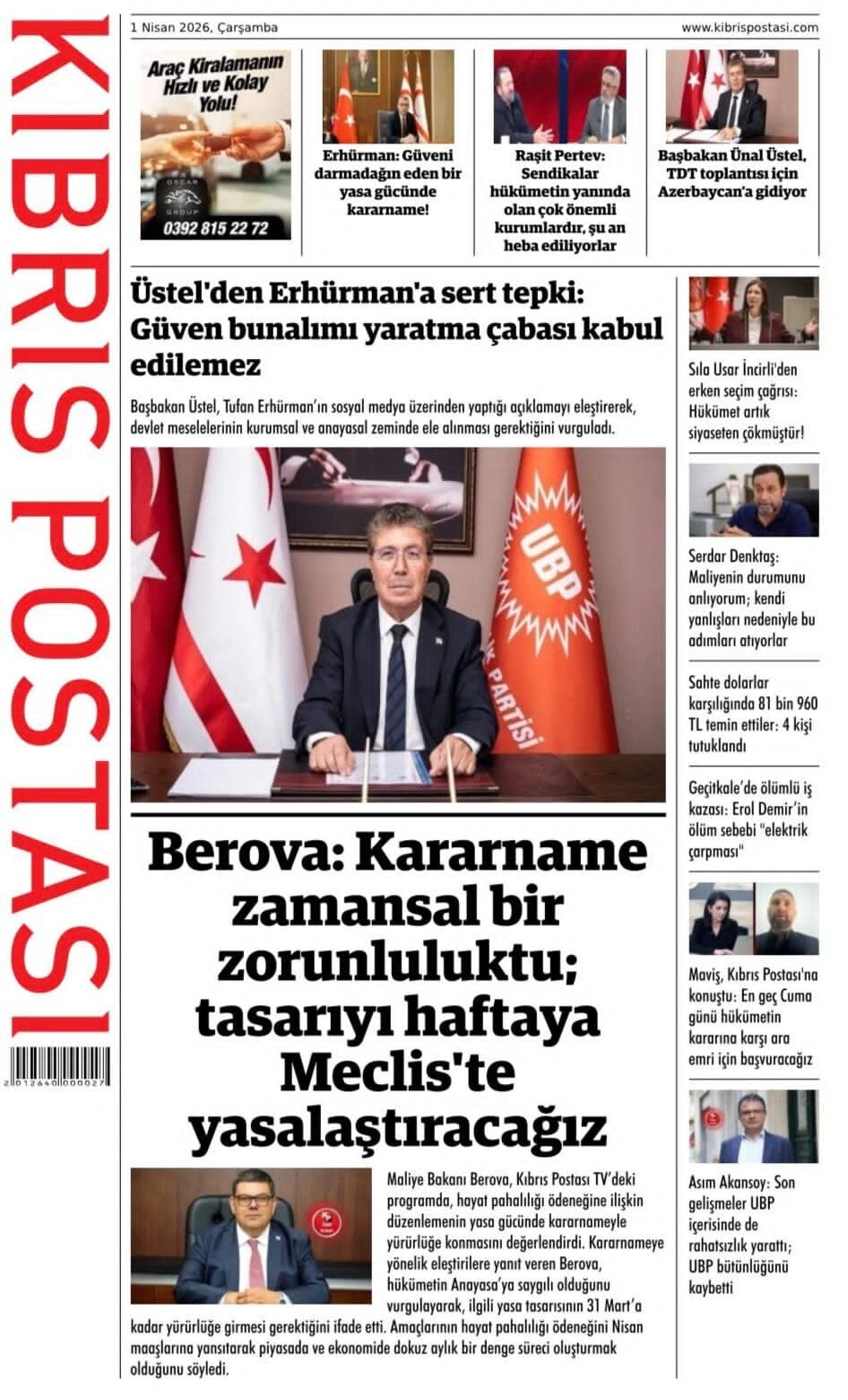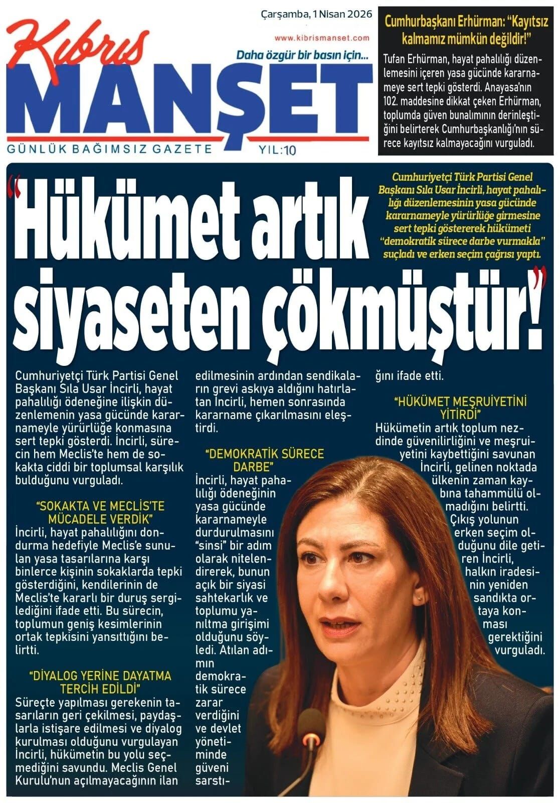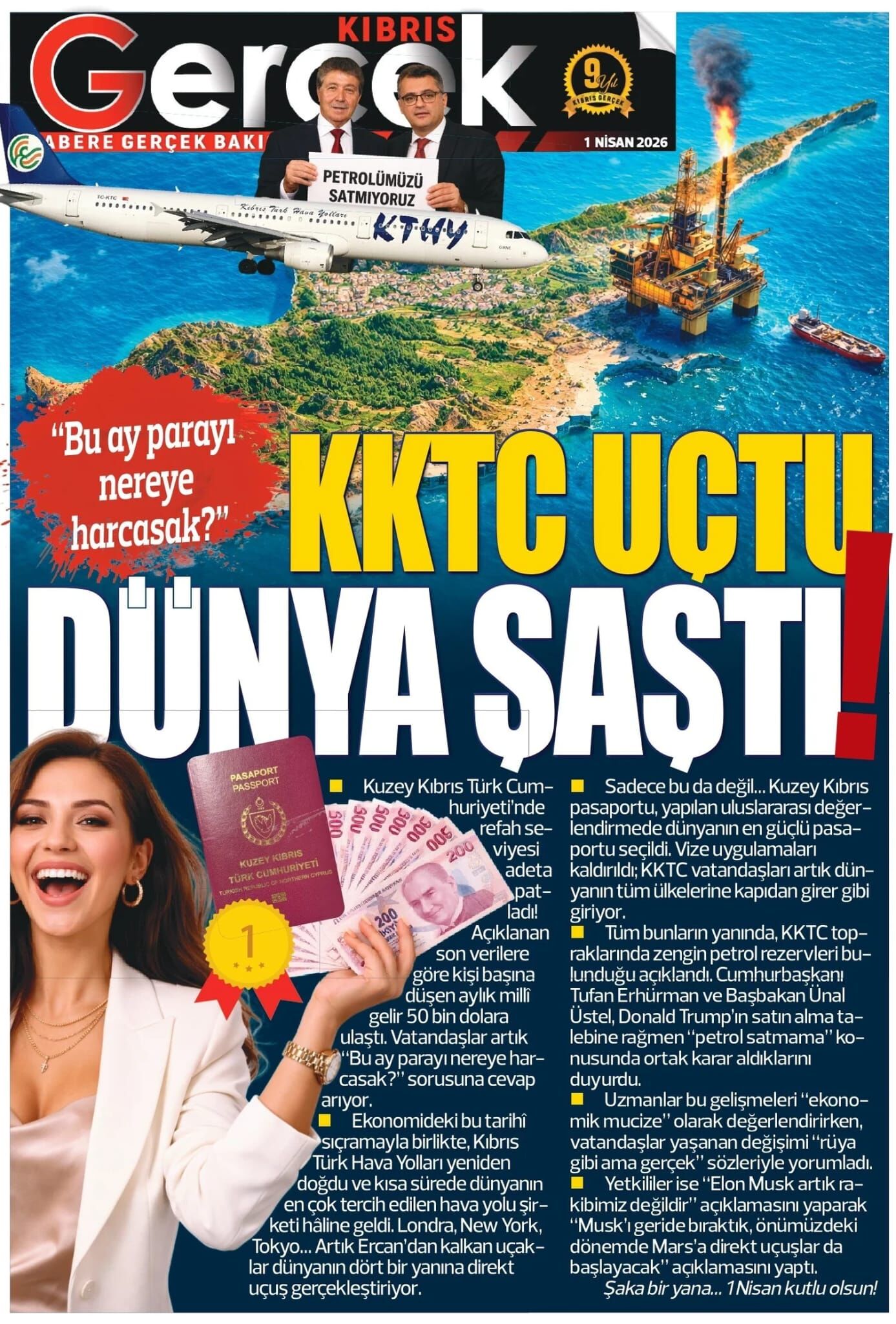 KıbrısKKTC GazeteleriGAZETE MANŞETLERİ (1 NİSAN 2026)Nisan 1, 2026 8:18 am PaylaşEtiketlendi:Kibris dakik KKTC gazeteleri manşetleri İlgili haberler BUGÜN HAVA NASIL OLACAK? (1 NİSAN 2026) Nisan 1, 2026 DÖVİZ KURLARI (01 NİSAN 2026) Nisan 1, 2026 SAVAŞAN: “SORUMLULUKTAN KAÇAN YÖNETEMEZ” Nisan 1, 2026 Cevap bırakın Yanıtı iptal etE-posta adresiniz yayınlanmayacak. Gerekli alanlar * ile işaretlenmişlerdirYorumAd * E-posta * İnternet sitesi Daha sonraki yorumlarımda kullanılması için adım, e-posta adresim ve site adresim bu tarayıcıya kaydedilsin.