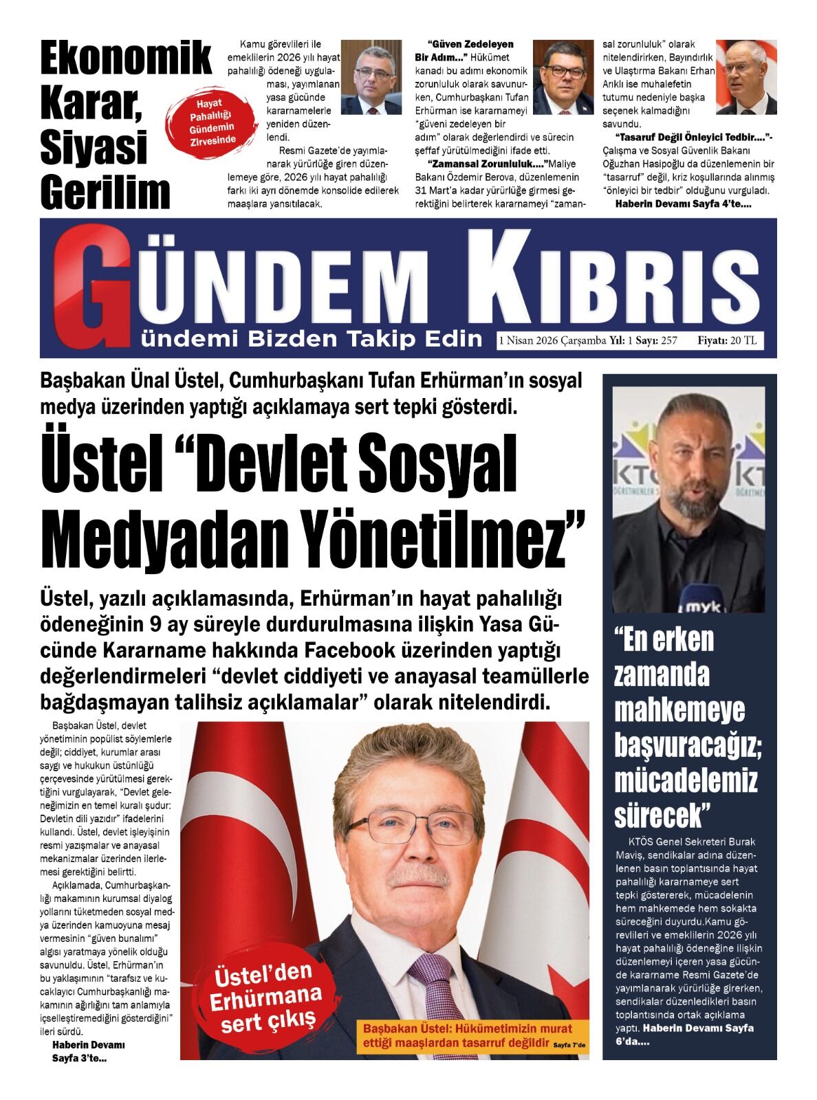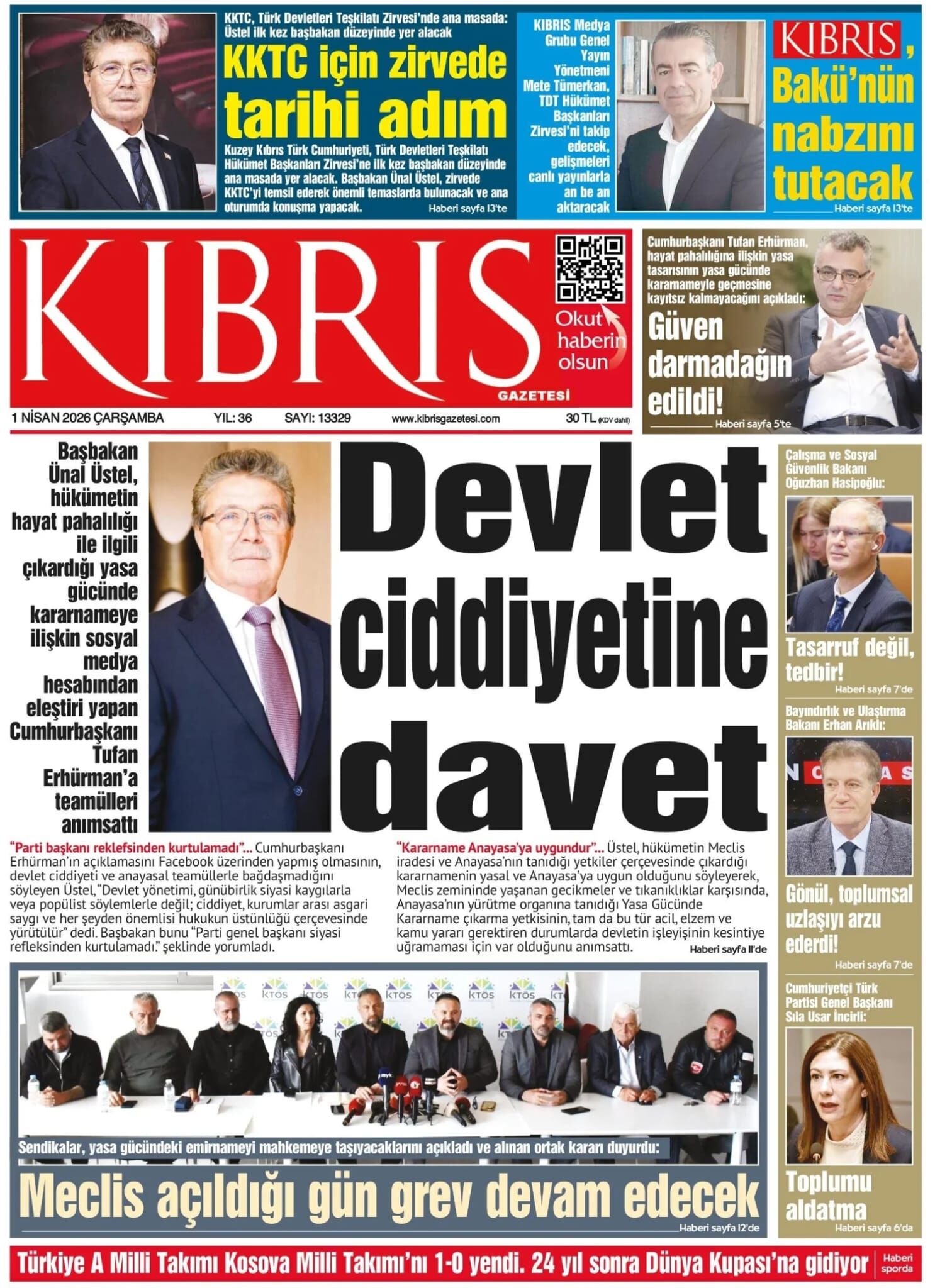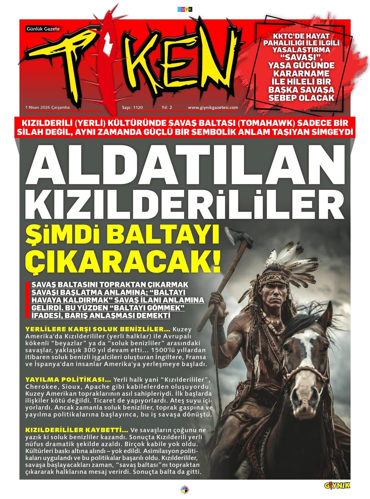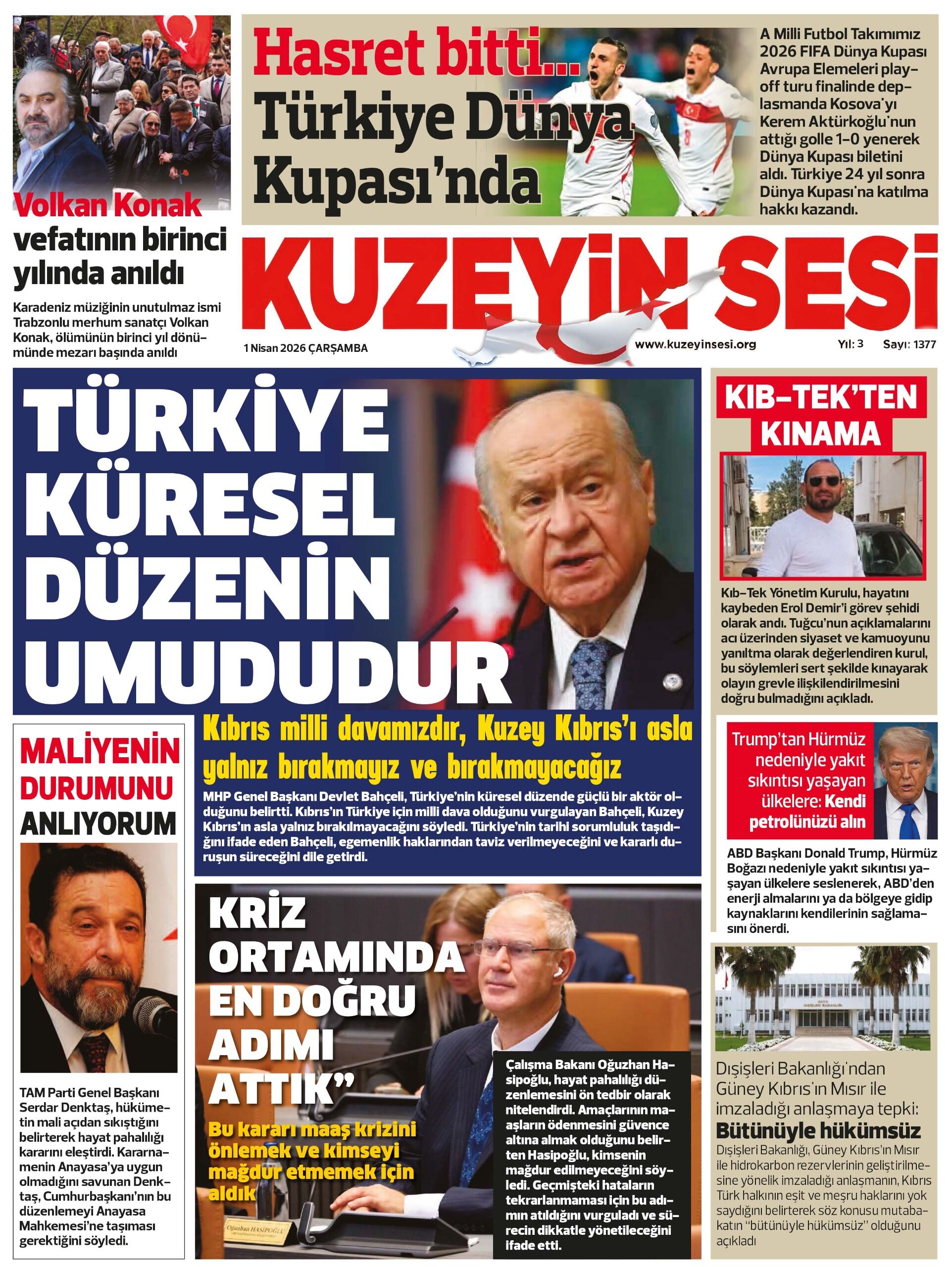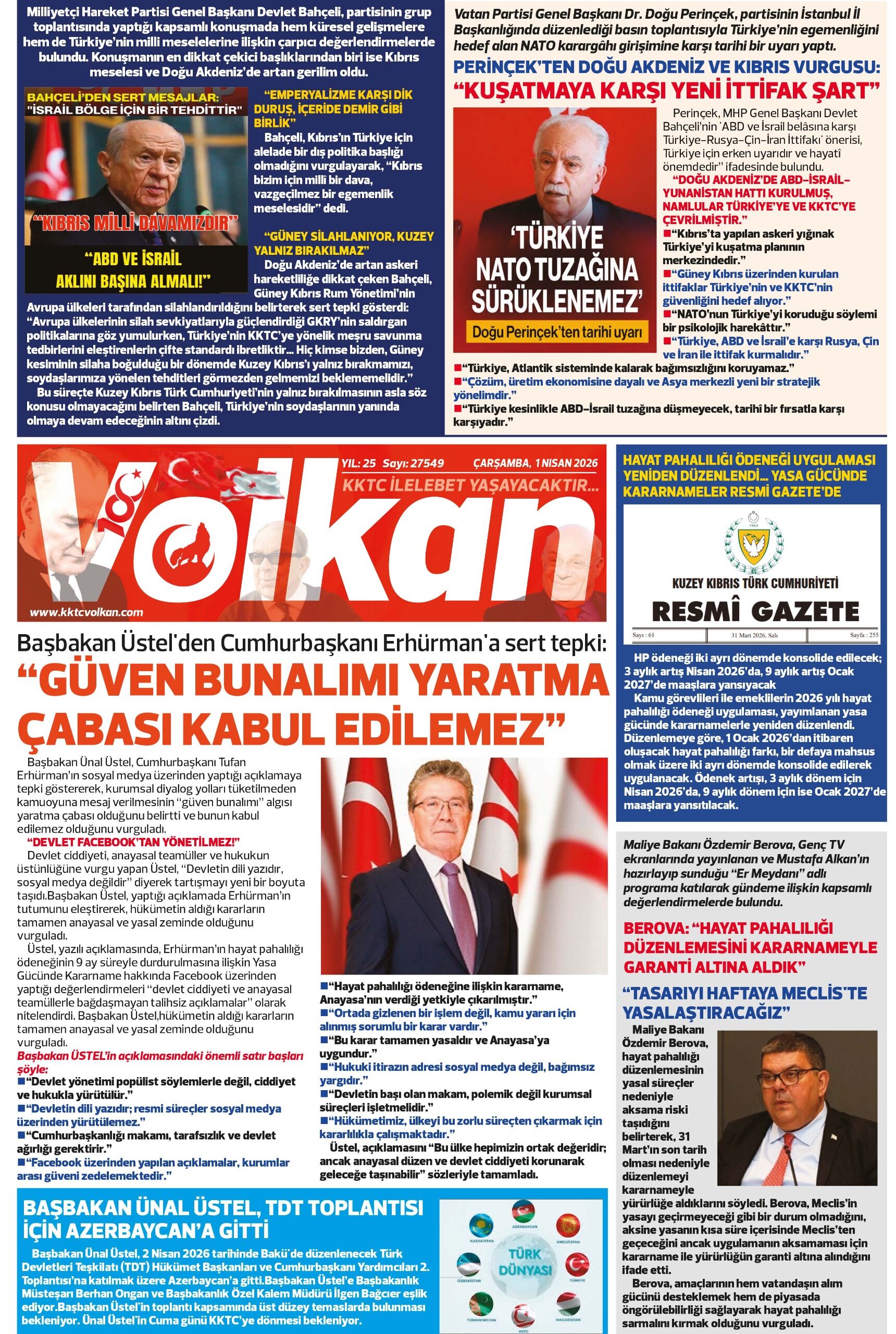 KıbrısKKTC GazeteleriGAZETE MANŞETLERİ (1 NİSAN 2026)Nisan 1, 2026 8:18 am PaylaşEtiketlendi:Kibris dakik KKTC gazeteleri manşetleri İlgili haberler BUGÜN HAVA NASIL OLACAK? (1 NİSAN 2026) Nisan 1, 2026 DÖVİZ KURLARI (01 NİSAN 2026) Nisan 1, 2026 SAVAŞAN: “SORUMLULUKTAN KAÇAN YÖNETEMEZ” Nisan 1, 2026 Cevap bırakın Yanıtı iptal etE-posta adresiniz yayınlanmayacak. Gerekli alanlar * ile işaretlenmişlerdirYorumAd * E-posta * İnternet sitesi Daha sonraki yorumlarımda kullanılması için adım, e-posta adresim ve site adresim bu tarayıcıya kaydedilsin.