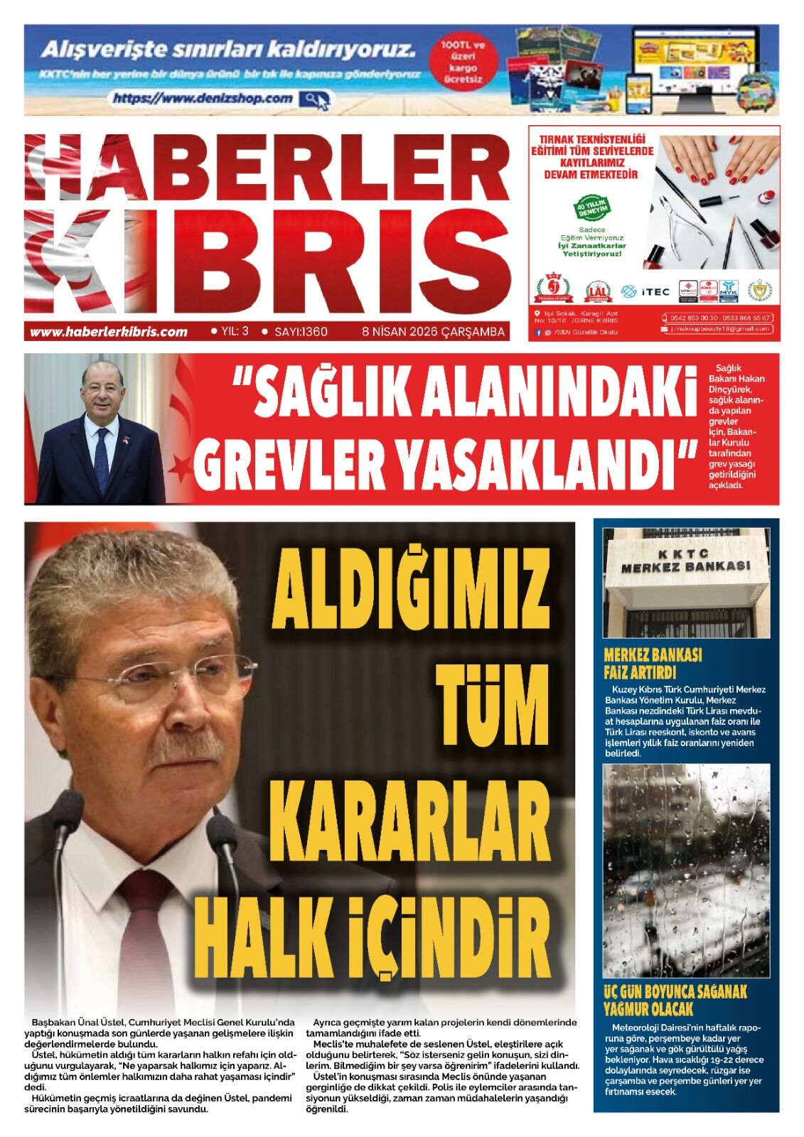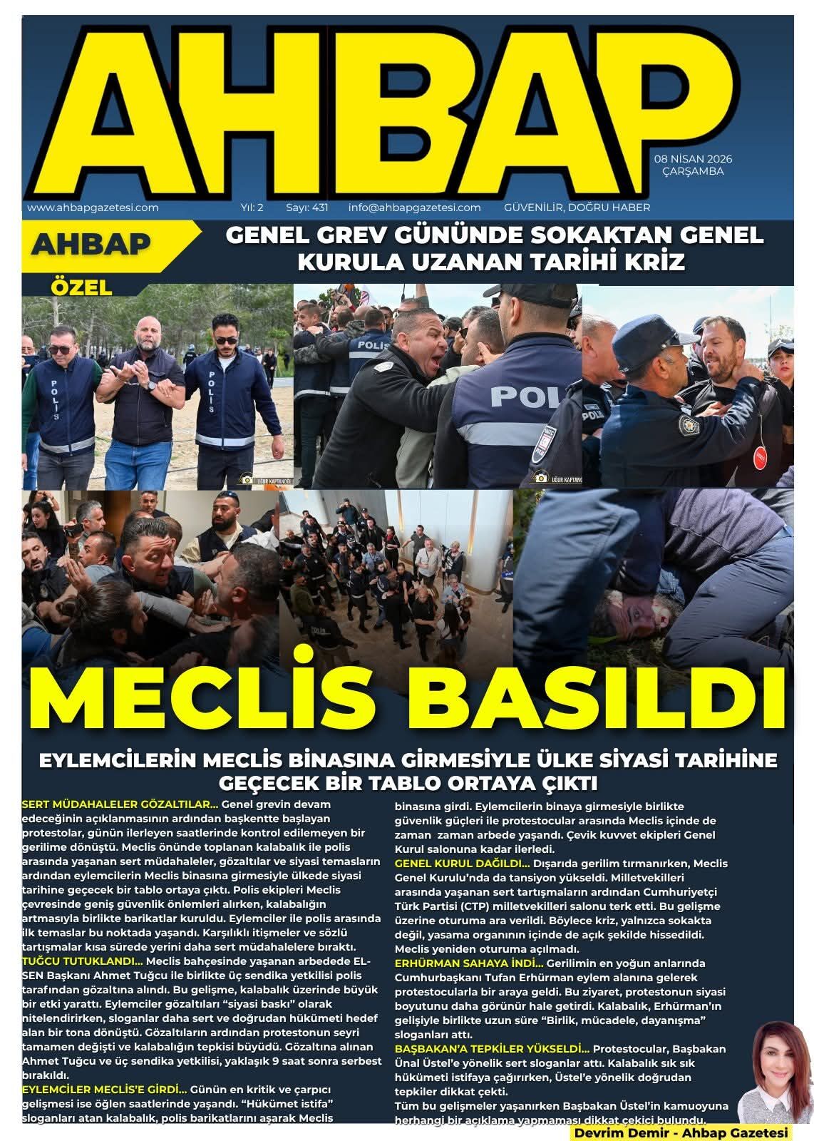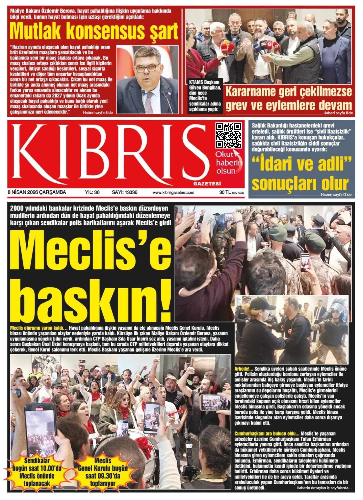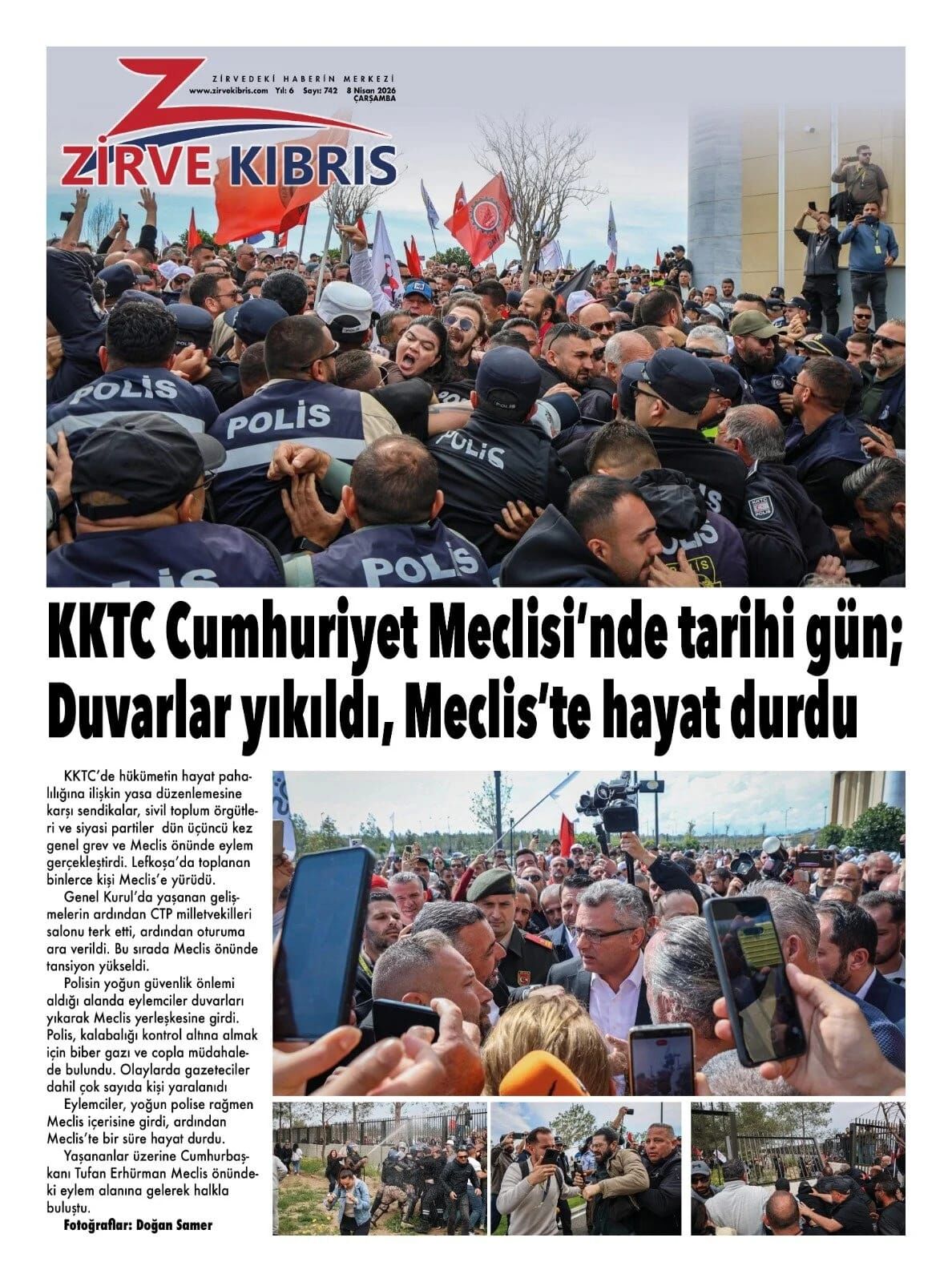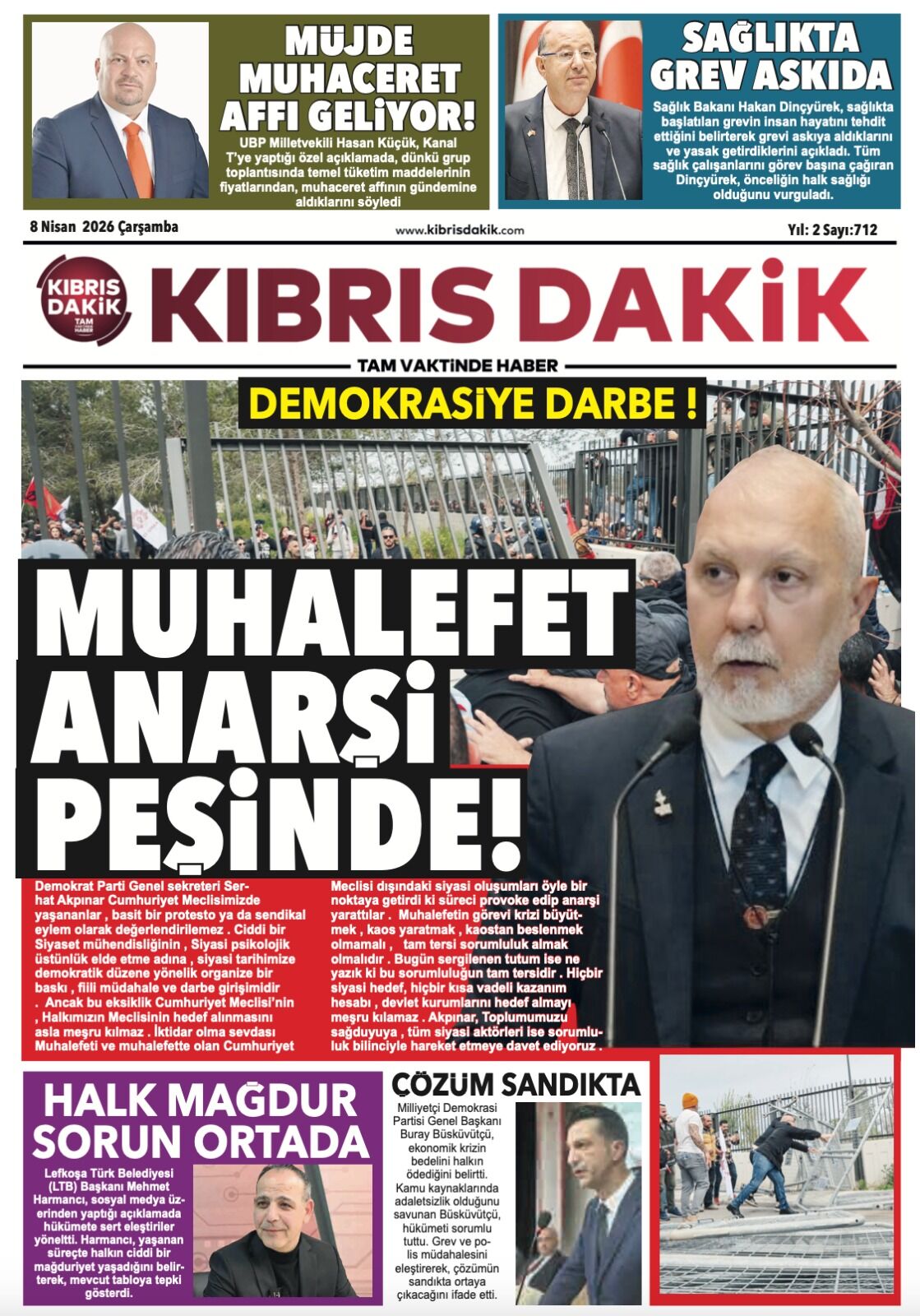 KıbrısGAZETE MANŞETLERİ (8 NİSAN 2026)Nisan 8, 2026 8:13 am PaylaşEtiketlendi:Kibris dakik KKTC gazeteleri manşetleri İlgili haberler ST. BARNABAS’TA SU YALITIMI VE ONARIM ÇALIŞMASI YAPILACAK Nisan 8, 2026 KIBRIS GAZİSİ HASAN DEMİR SON YOLCULUĞUNA UĞURLANDI Nisan 8, 2026 MECLİS’TE KRİTİK GÜN: GENEL KURUL YENİDEN TOPLANIYOR Nisan 8, 2026 Cevap bırakın Yanıtı iptal etE-posta adresiniz yayınlanmayacak. Gerekli alanlar * ile işaretlenmişlerdirYorumAd * E-posta * İnternet sitesi Daha sonraki yorumlarımda kullanılması için adım, e-posta adresim ve site adresim bu tarayıcıya kaydedilsin.