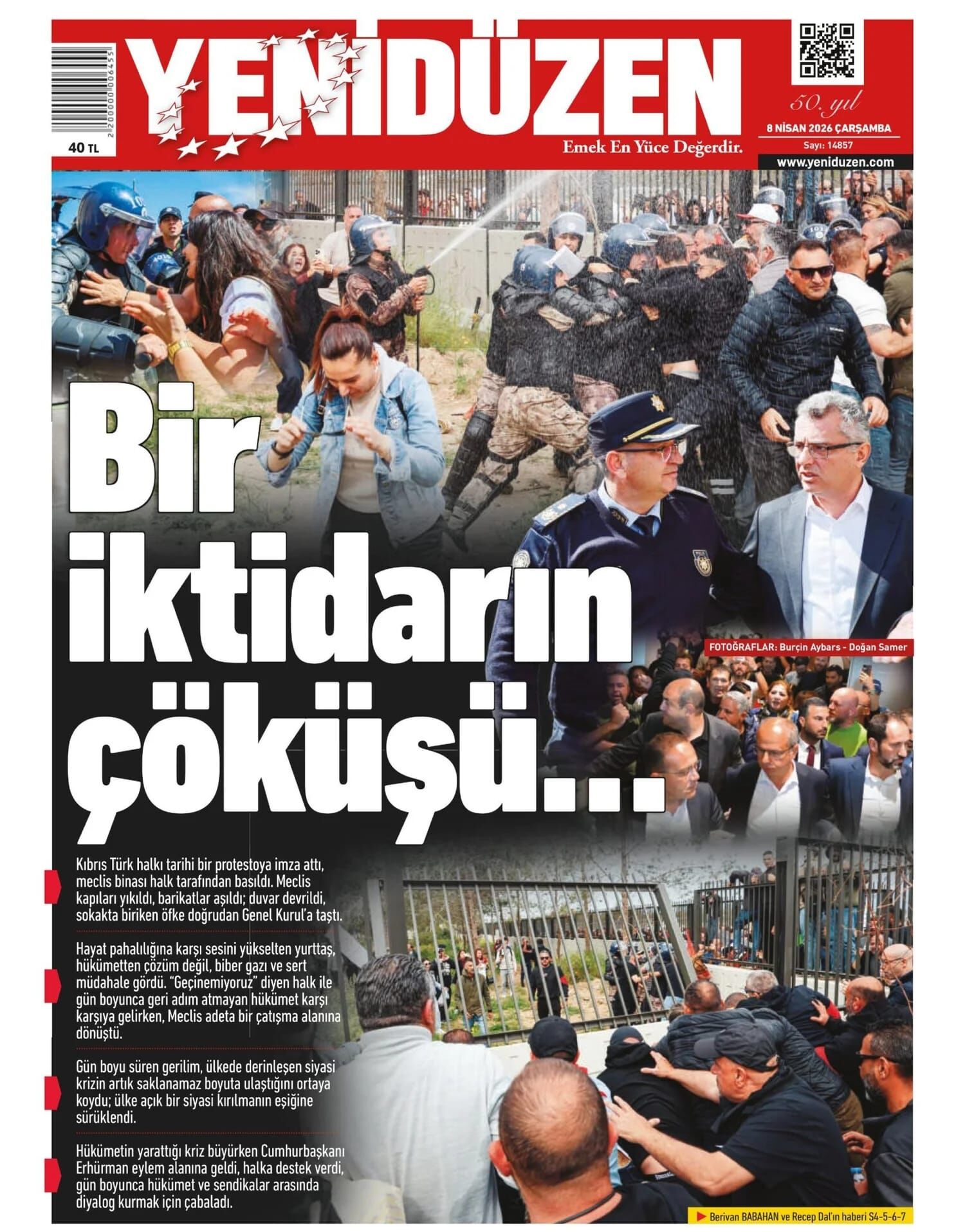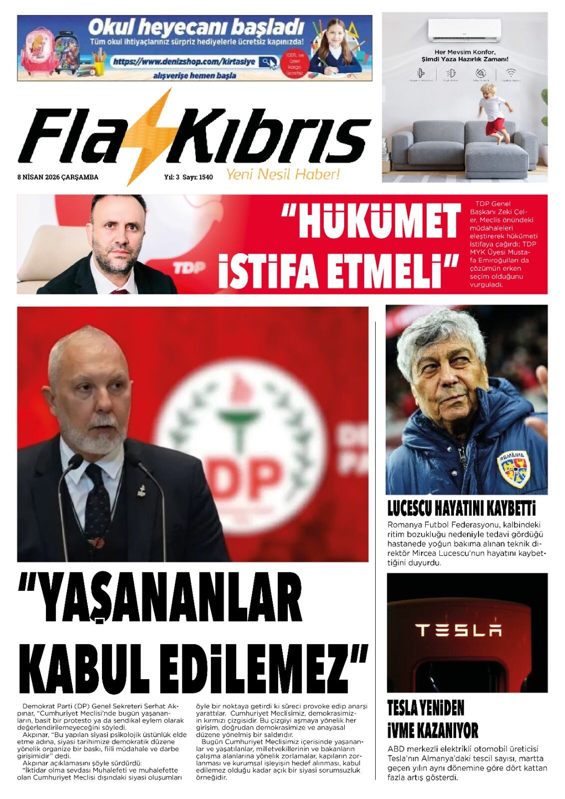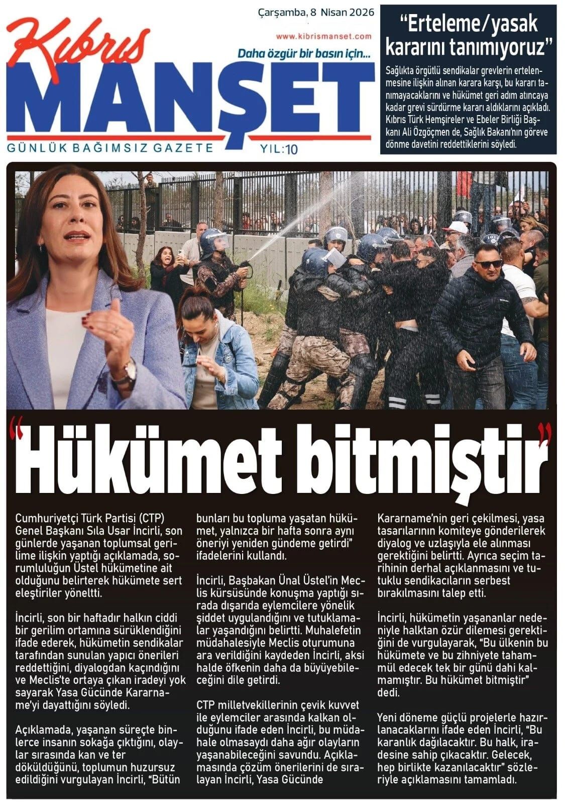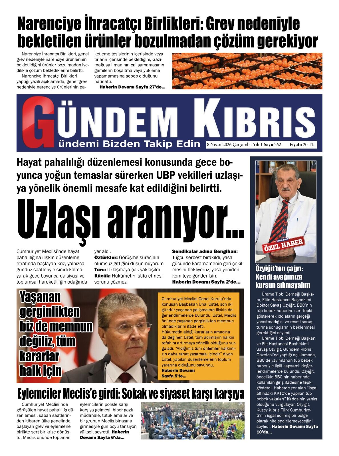 KıbrısGAZETE MANŞETLERİ (8 NİSAN 2026)Nisan 8, 2026 8:13 am PaylaşEtiketlendi:Kibris dakik KKTC gazeteleri manşetleri İlgili haberler ST. BARNABAS’TA SU YALITIMI VE ONARIM ÇALIŞMASI YAPILACAK Nisan 8, 2026 KIBRIS GAZİSİ HASAN DEMİR SON YOLCULUĞUNA UĞURLANDI Nisan 8, 2026 MECLİS’TE KRİTİK GÜN: GENEL KURUL YENİDEN TOPLANIYOR Nisan 8, 2026 Cevap bırakın Yanıtı iptal etE-posta adresiniz yayınlanmayacak. Gerekli alanlar * ile işaretlenmişlerdirYorumAd * E-posta * İnternet sitesi Daha sonraki yorumlarımda kullanılması için adım, e-posta adresim ve site adresim bu tarayıcıya kaydedilsin.