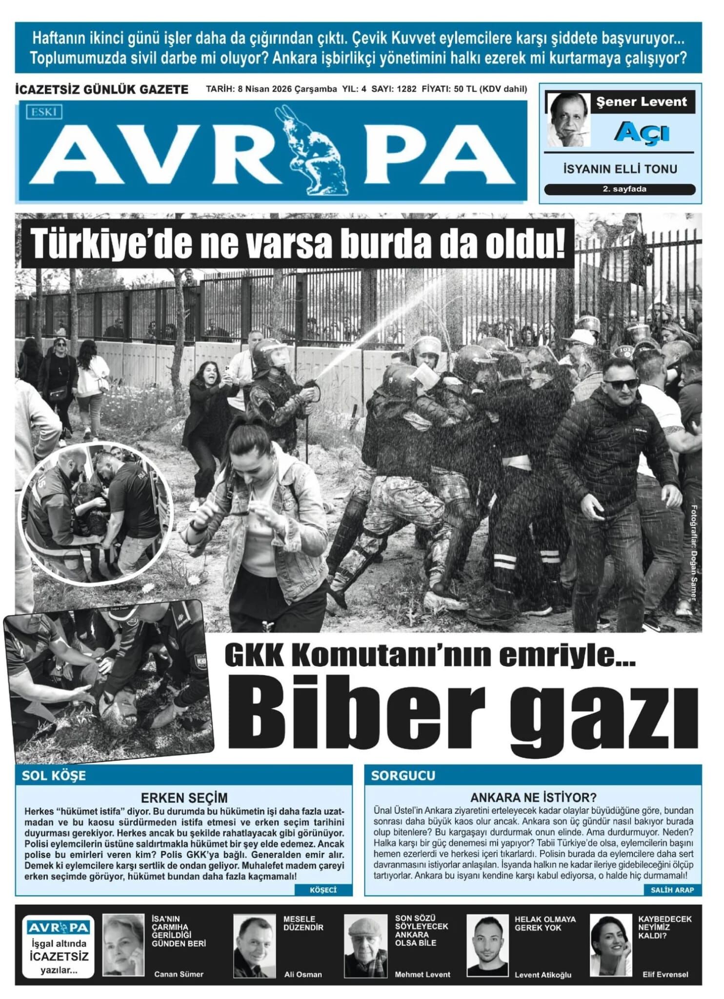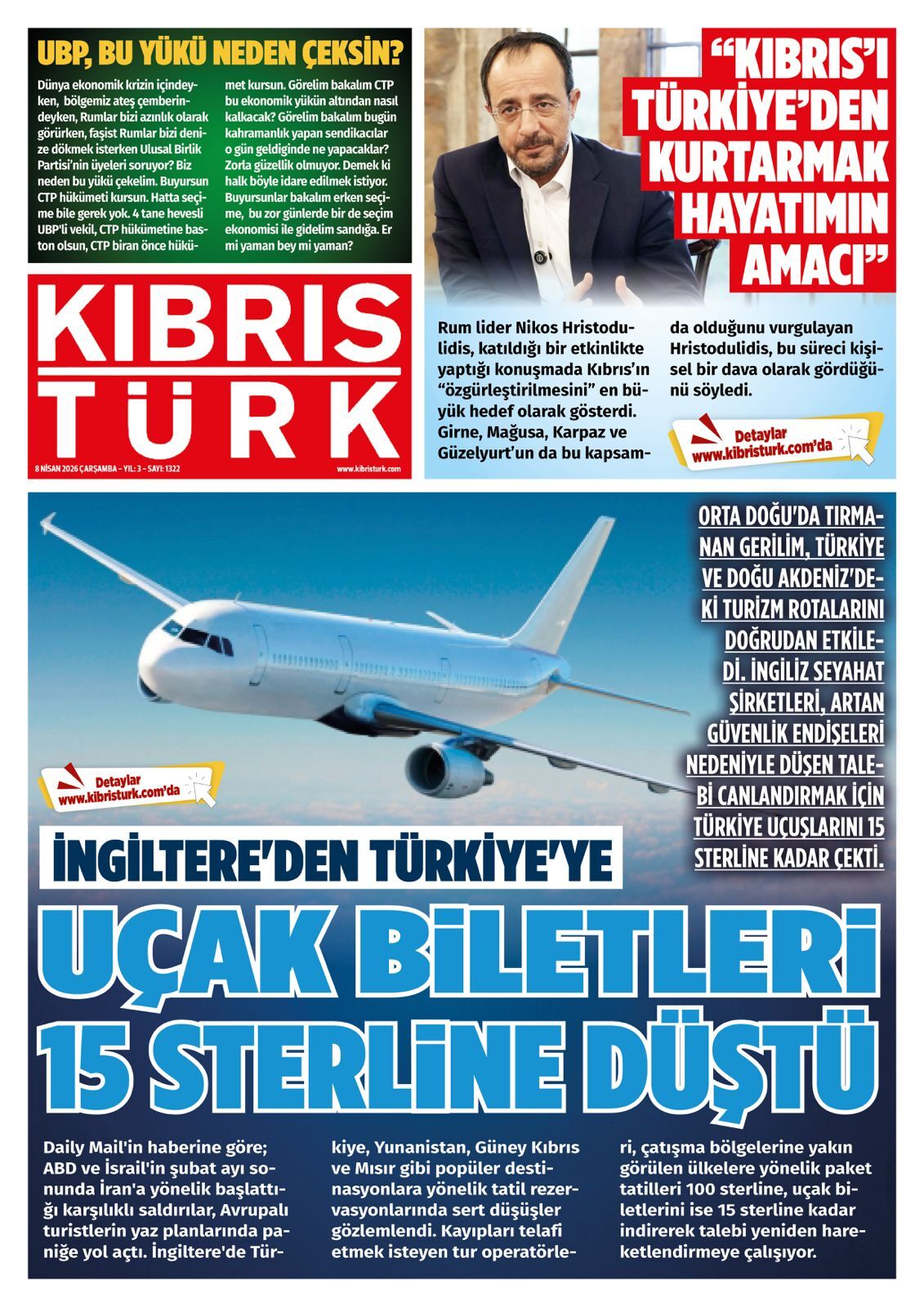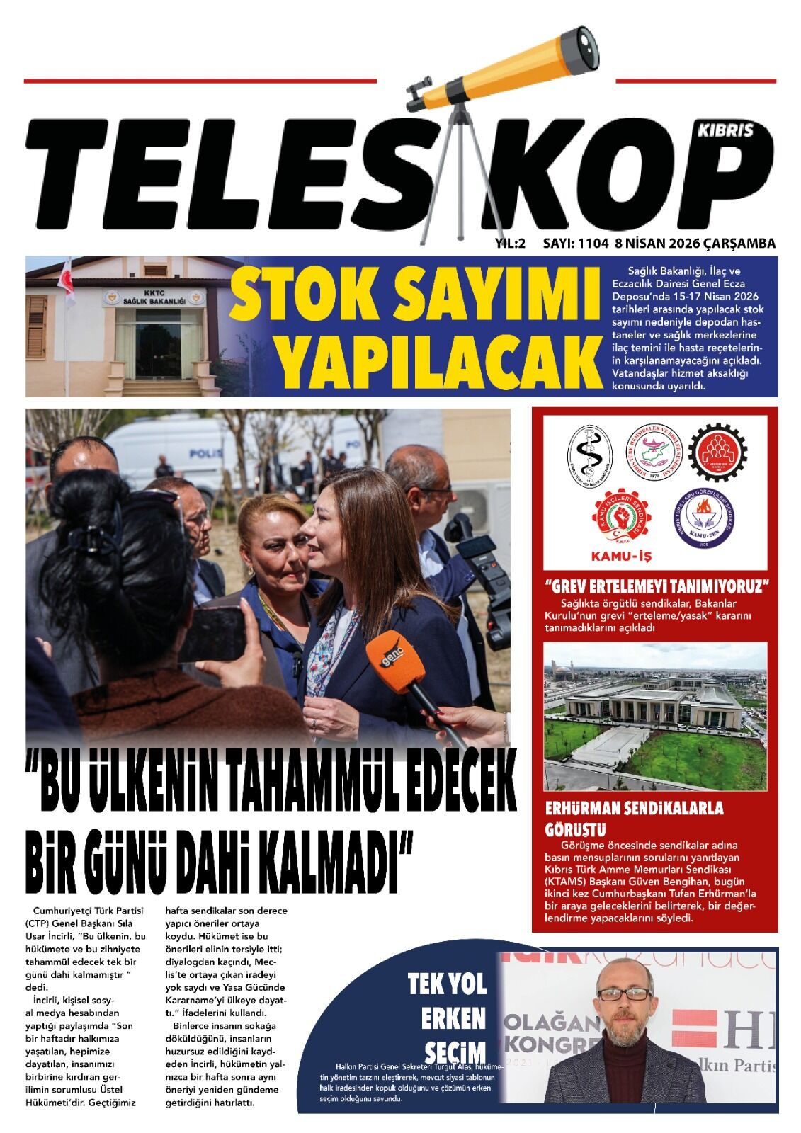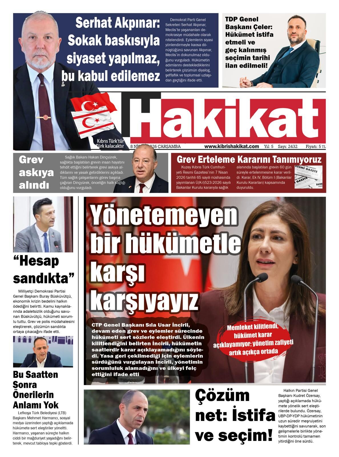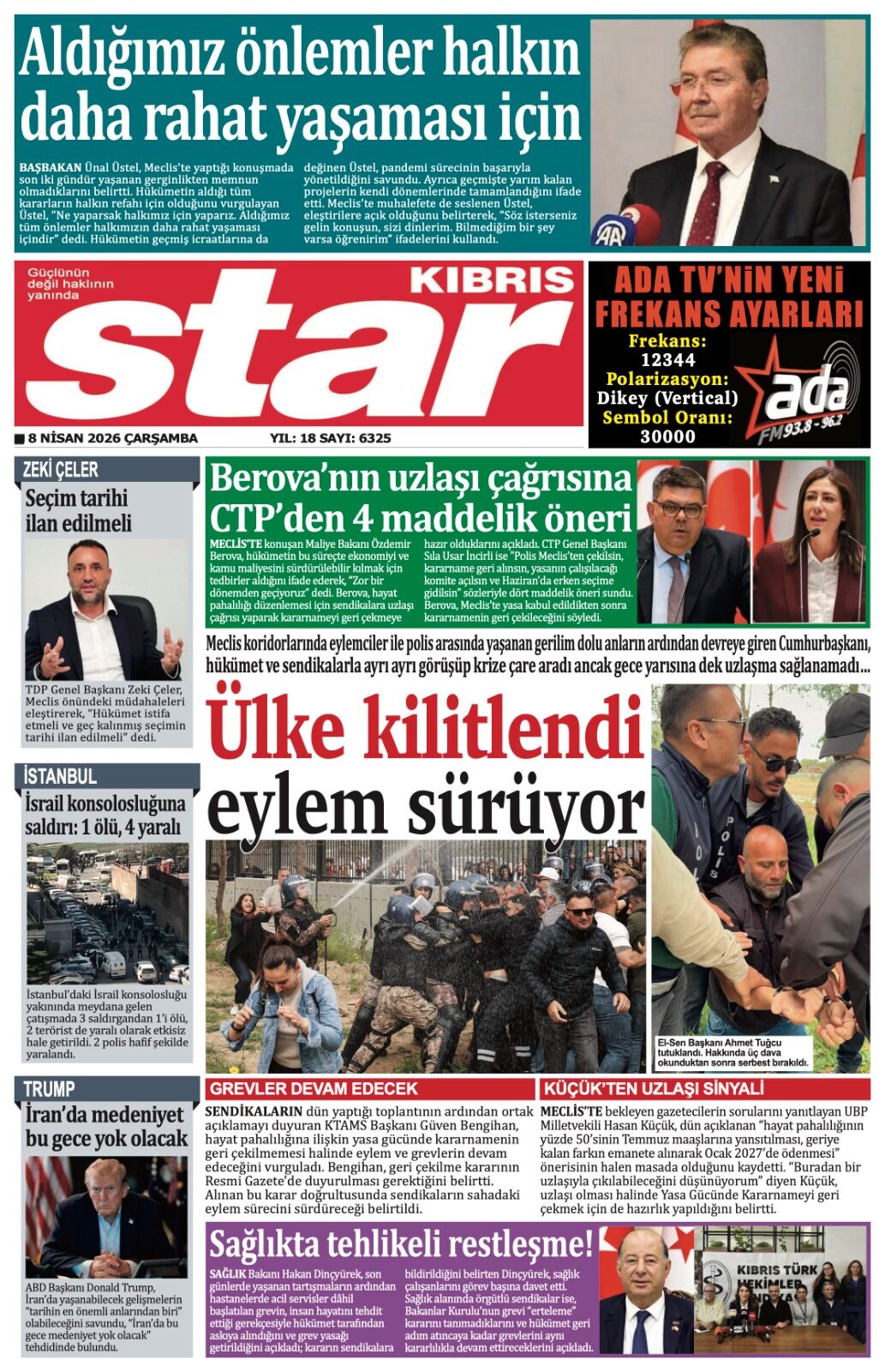 KıbrısGAZETE MANŞETLERİ (8 NİSAN 2026)Nisan 8, 2026 8:13 am PaylaşEtiketlendi:Kibris dakik KKTC gazeteleri manşetleri İlgili haberler ST. BARNABAS’TA SU YALITIMI VE ONARIM ÇALIŞMASI YAPILACAK Nisan 8, 2026 KIBRIS GAZİSİ HASAN DEMİR SON YOLCULUĞUNA UĞURLANDI Nisan 8, 2026 MECLİS’TE KRİTİK GÜN: GENEL KURUL YENİDEN TOPLANIYOR Nisan 8, 2026 Cevap bırakın Yanıtı iptal etE-posta adresiniz yayınlanmayacak. Gerekli alanlar * ile işaretlenmişlerdirYorumAd * E-posta * İnternet sitesi Daha sonraki yorumlarımda kullanılması için adım, e-posta adresim ve site adresim bu tarayıcıya kaydedilsin.
