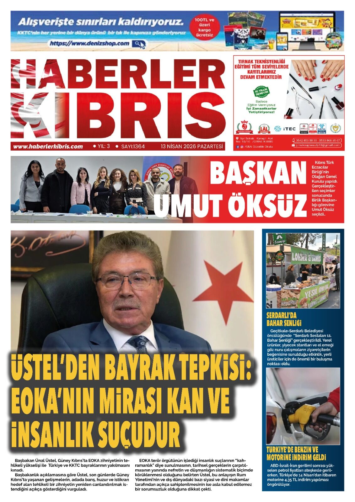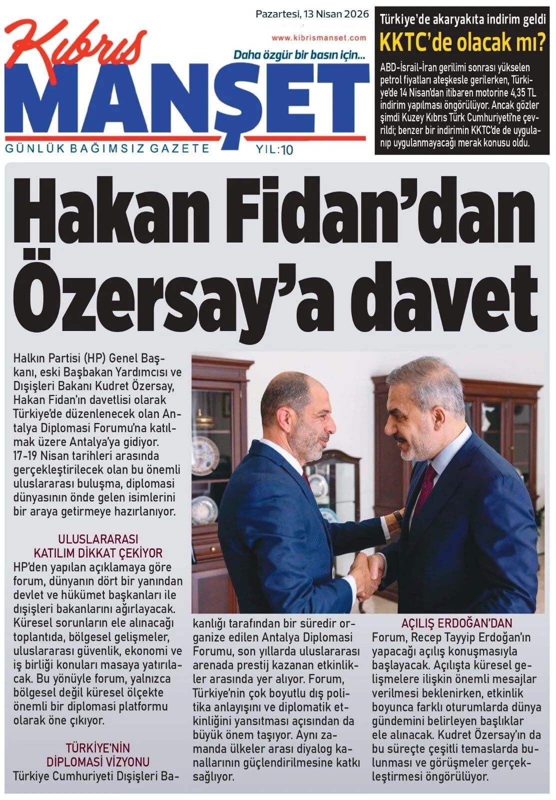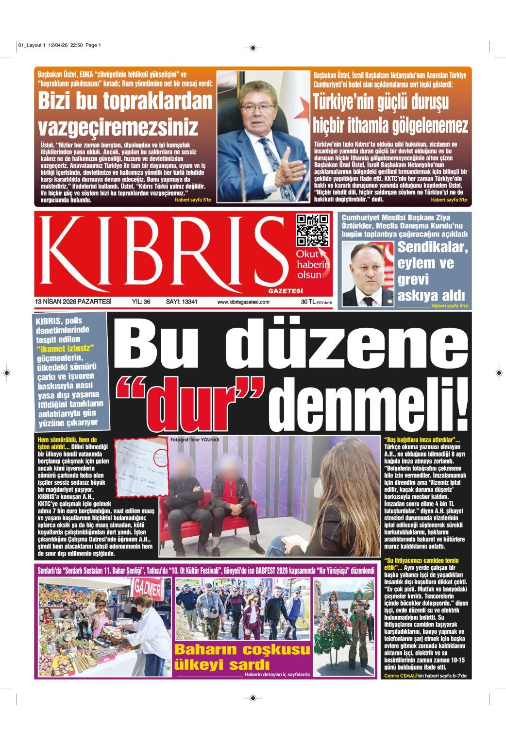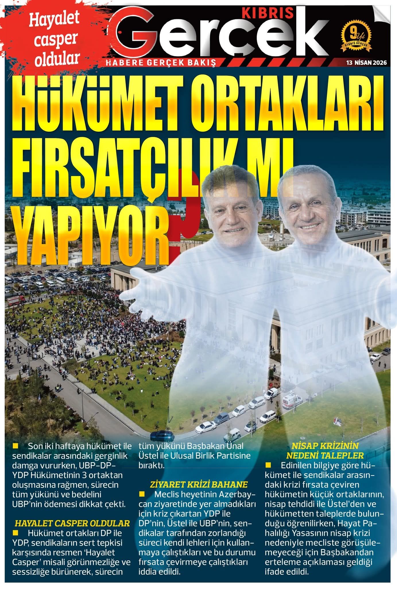 KıbrısKKTC GazeteleriTürkiyeGAZETE MANŞETLERİ (13 NİSAN 2026)Nisan 13, 2026 8:05 am PaylaşEtiketlendi:Kibris dakik KKTC gazeteleri manşetleri İlgili haberler IRAK MECLİSİ’NDE CUMHURBAŞKANI SEÇİMİ İKİNCİ TURA KALDI Nisan 11, 2026 MEDYA ETİK KURULU’NDAN YAYINLARA KINAMA Nisan 11, 2026 DAÜ GİRİŞ VE BURS SINAVI TARİHLERİ AÇIKLANDI Nisan 11, 2026 Cevap bırakın Yanıtı iptal etE-posta adresiniz yayınlanmayacak. Gerekli alanlar * ile işaretlenmişlerdirYorumAd * E-posta * İnternet sitesi Daha sonraki yorumlarımda kullanılması için adım, e-posta adresim ve site adresim bu tarayıcıya kaydedilsin.