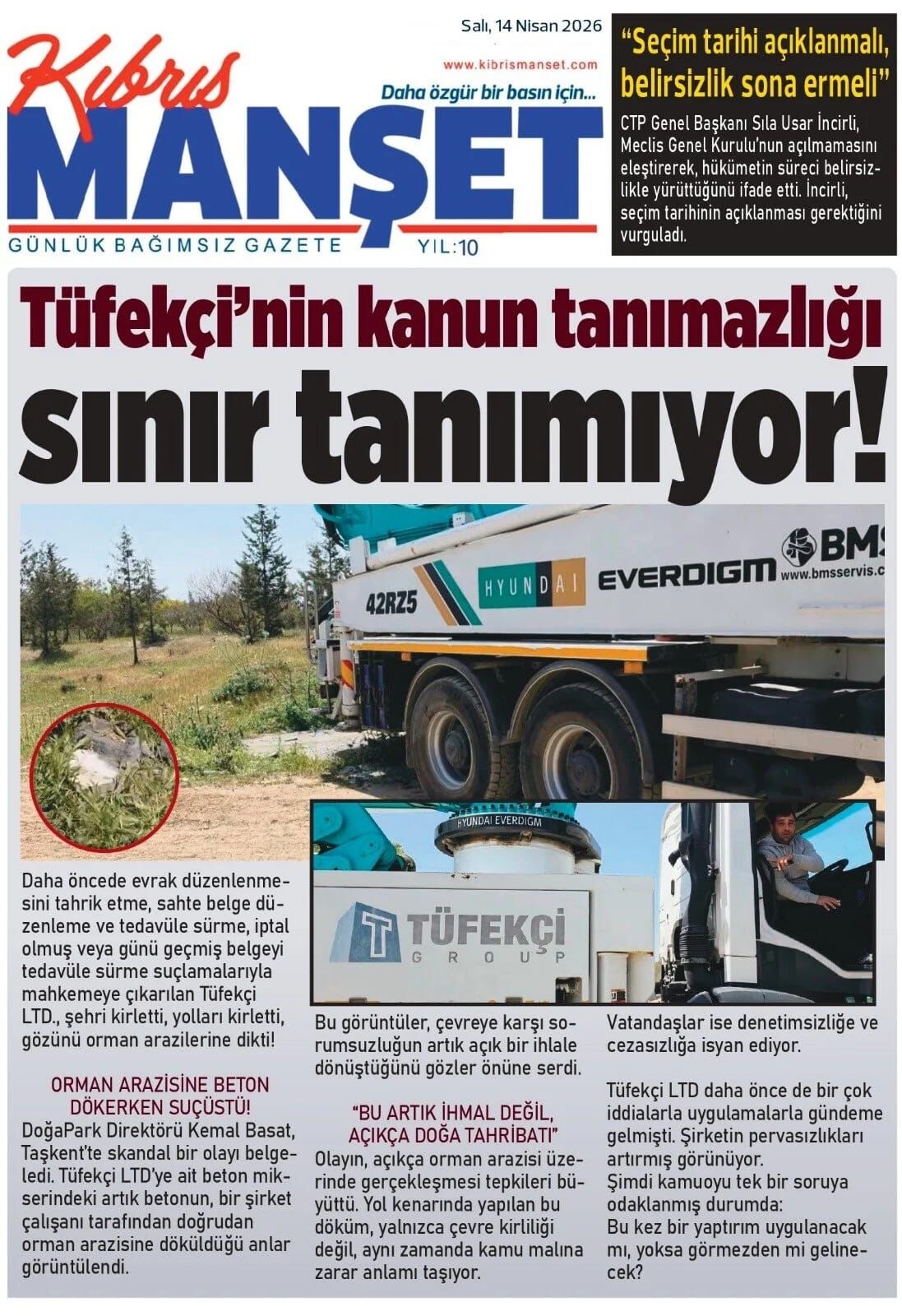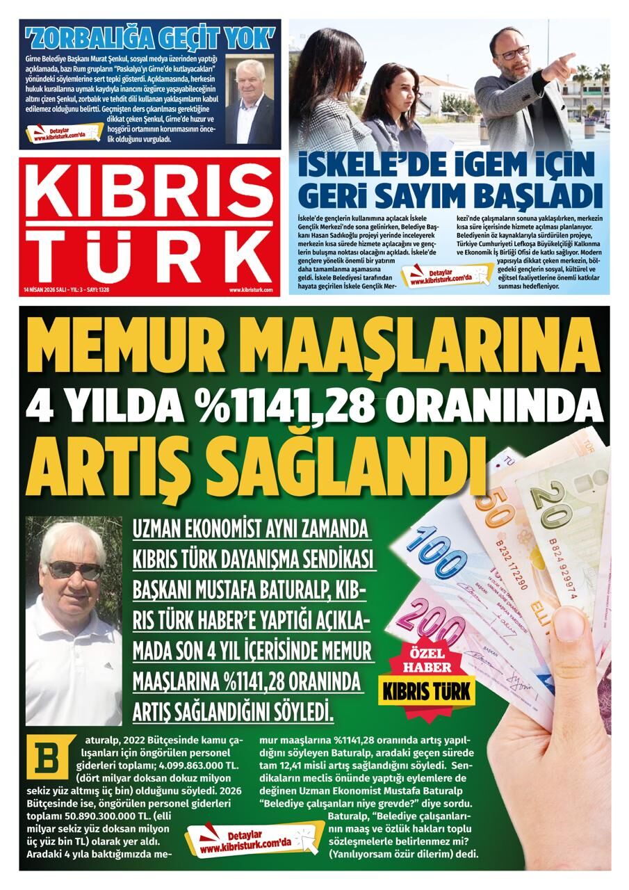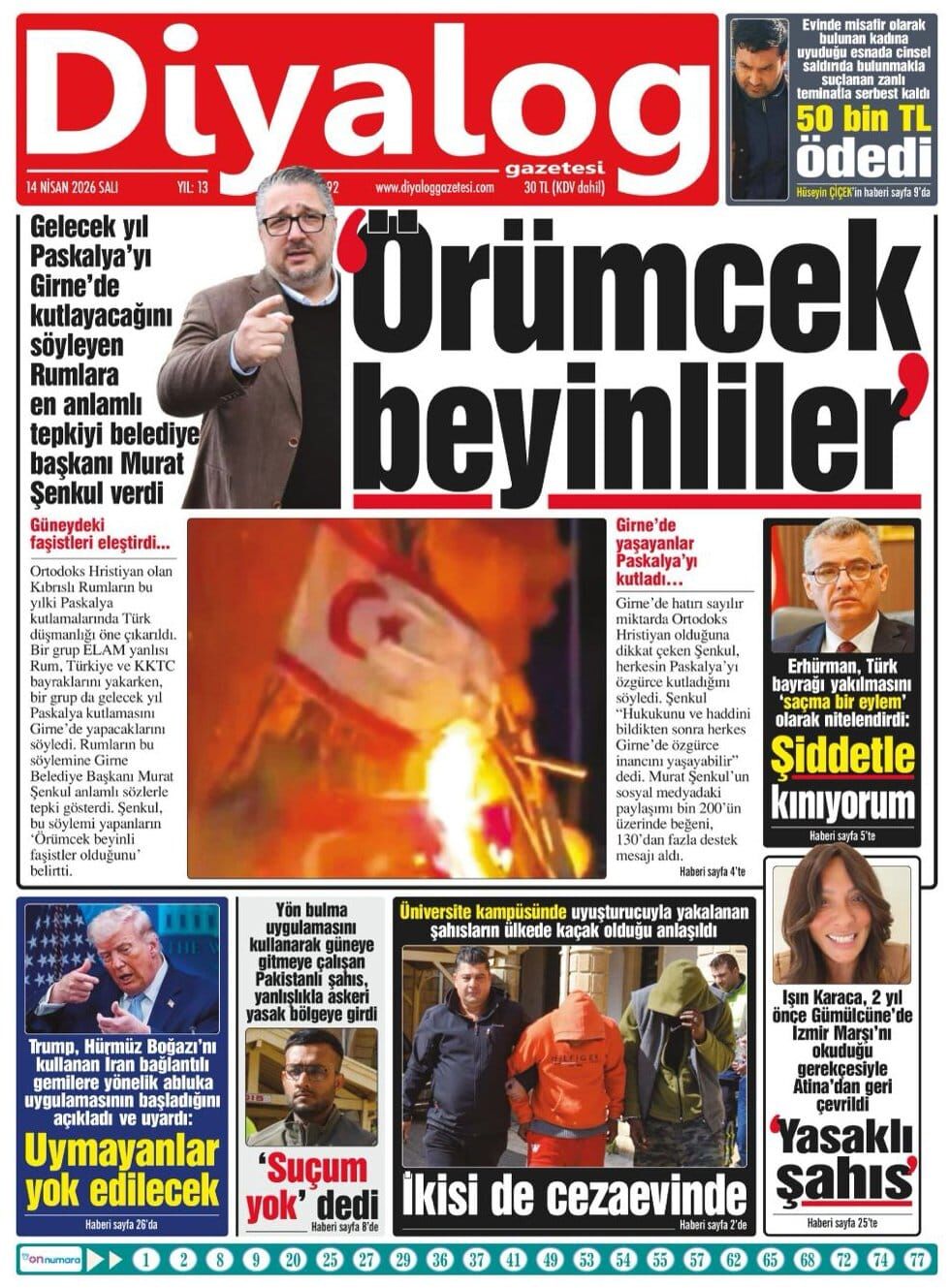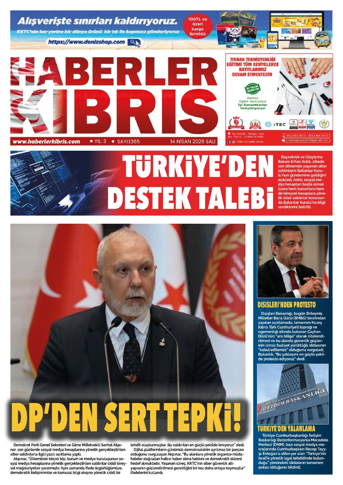 KıbrısGAZETE MANŞETLERİ (14 NİSAN 2026)Nisan 14, 2026 8:10 am PaylaşEtiketlendi:Kibris dakik KKTC gazeteleri manşetleri İlgili haberler GÜLBAHAR: ERHÜRMAN NET TAVIR KOYMALI Nisan 14, 2026 DÖVİZ KURLARI (14 NİSAN 2026) Nisan 14, 2026 HULUSİ AKAR'DAN SERT TEPKİ Nisan 14, 2026 Cevap bırakın Yanıtı iptal etE-posta adresiniz yayınlanmayacak. Gerekli alanlar * ile işaretlenmişlerdirYorumAd * E-posta * İnternet sitesi Daha sonraki yorumlarımda kullanılması için adım, e-posta adresim ve site adresim bu tarayıcıya kaydedilsin.