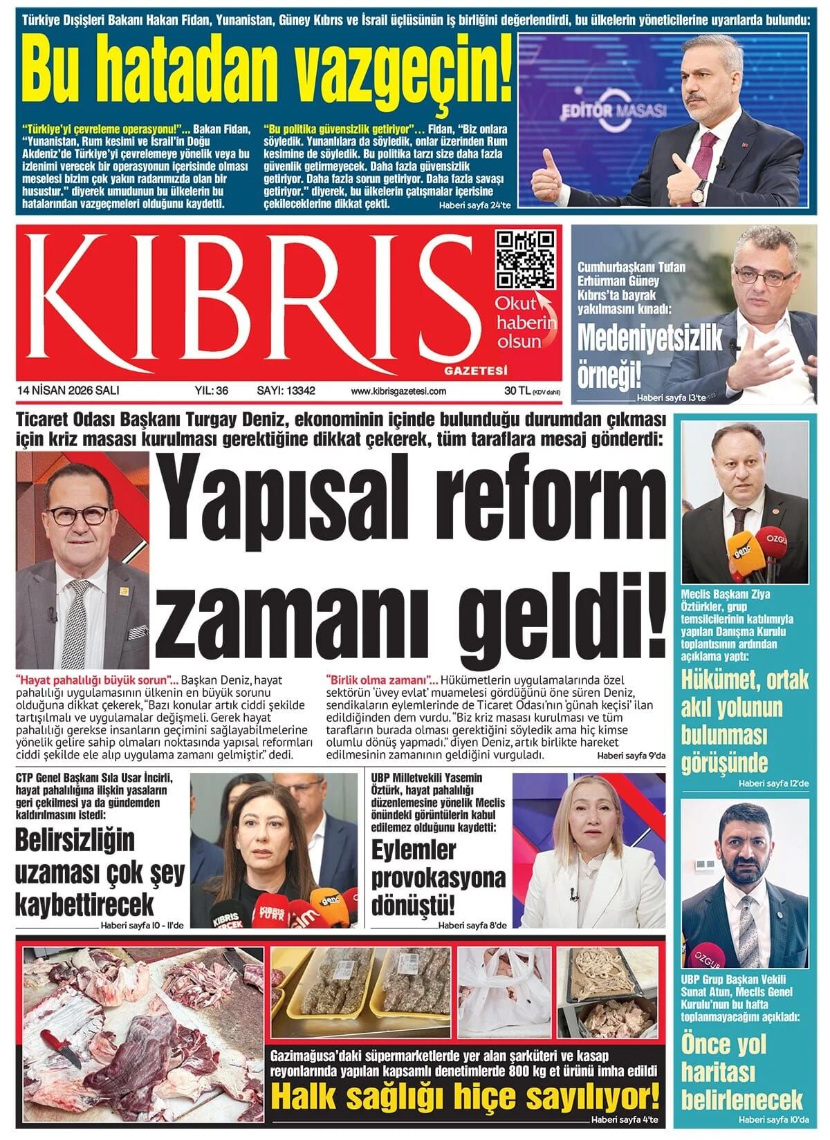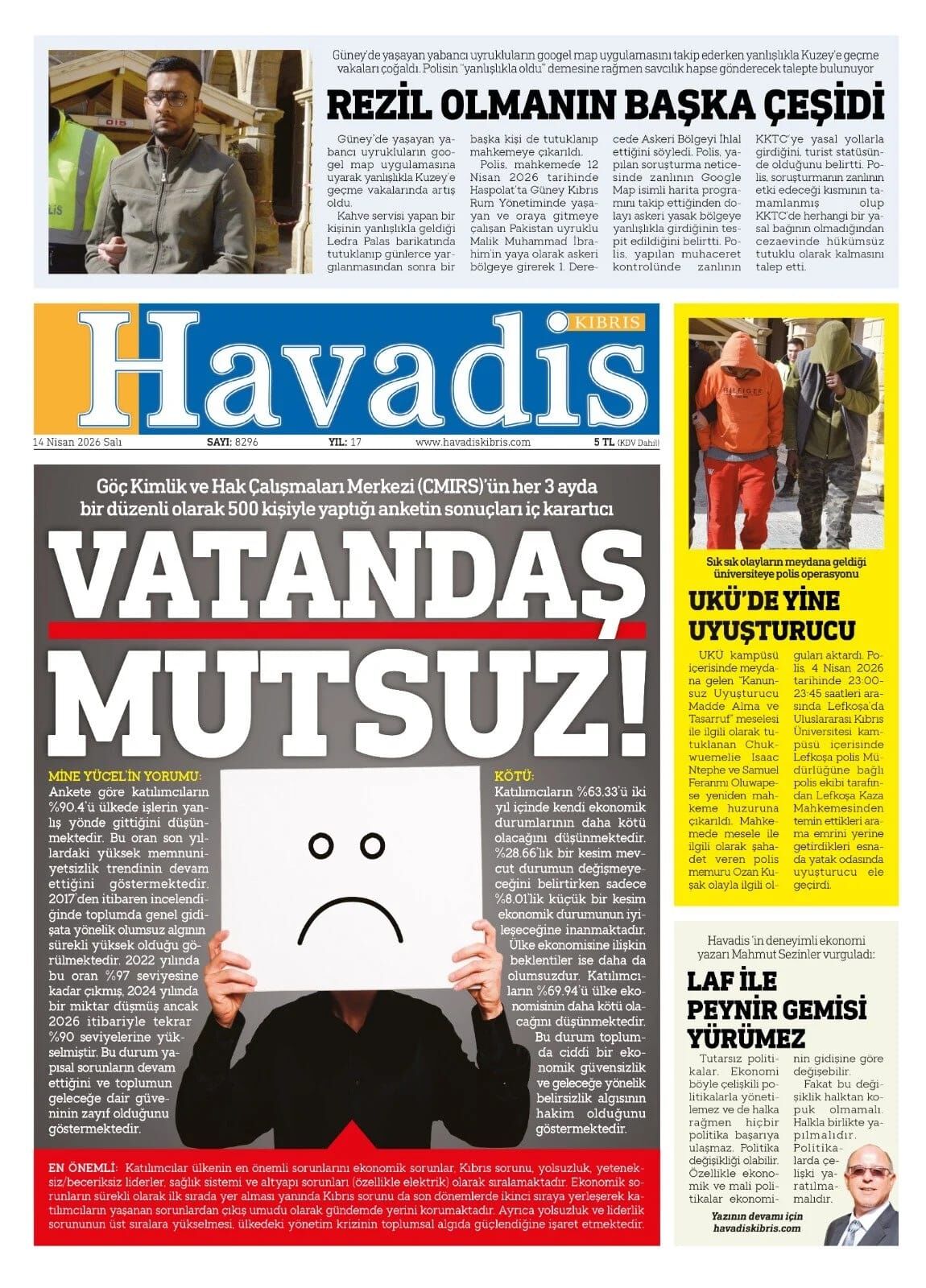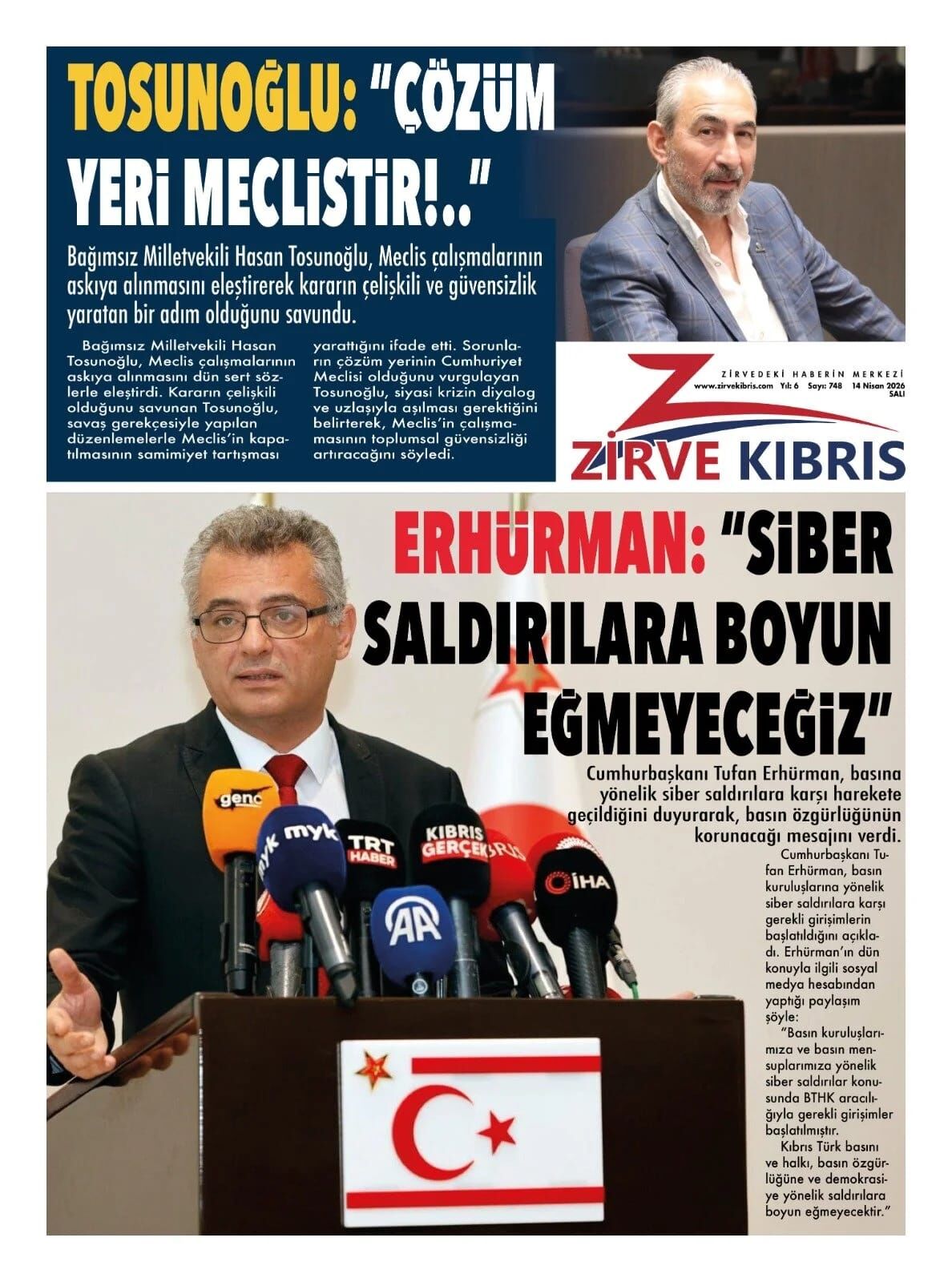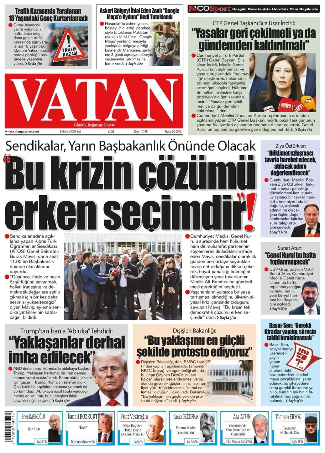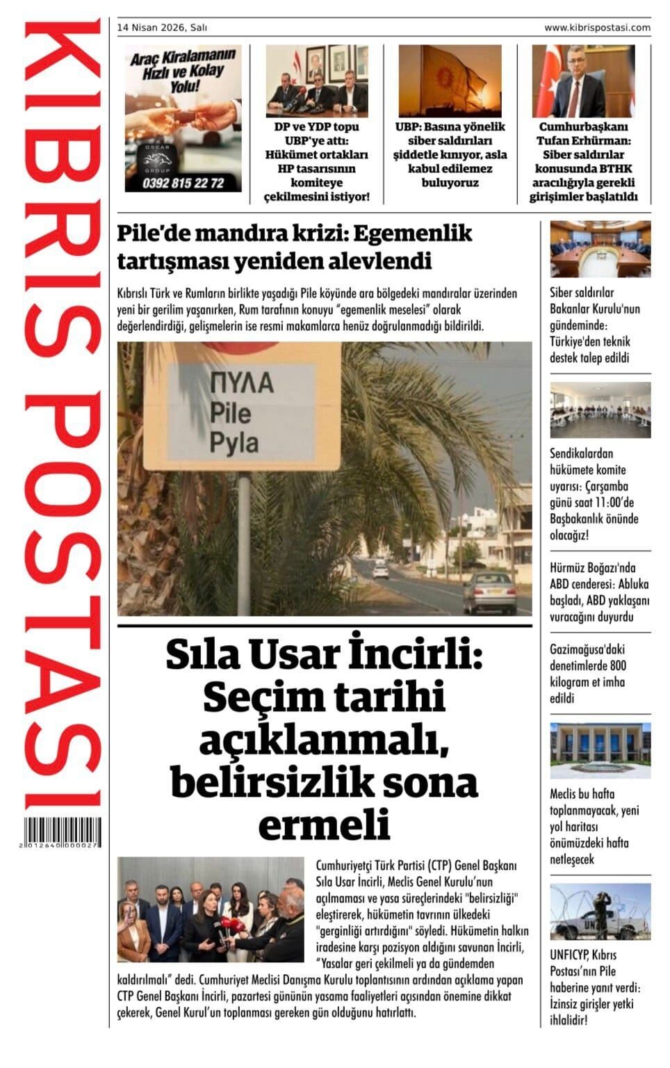 KıbrısGAZETE MANŞETLERİ (14 NİSAN 2026)Nisan 14, 2026 8:10 am PaylaşEtiketlendi:Kibris dakik KKTC gazeteleri manşetleri İlgili haberler GÜLBAHAR: ERHÜRMAN NET TAVIR KOYMALI Nisan 14, 2026 DÖVİZ KURLARI (14 NİSAN 2026) Nisan 14, 2026 HULUSİ AKAR'DAN SERT TEPKİ Nisan 14, 2026 Cevap bırakın Yanıtı iptal etE-posta adresiniz yayınlanmayacak. Gerekli alanlar * ile işaretlenmişlerdirYorumAd * E-posta * İnternet sitesi Daha sonraki yorumlarımda kullanılması için adım, e-posta adresim ve site adresim bu tarayıcıya kaydedilsin.