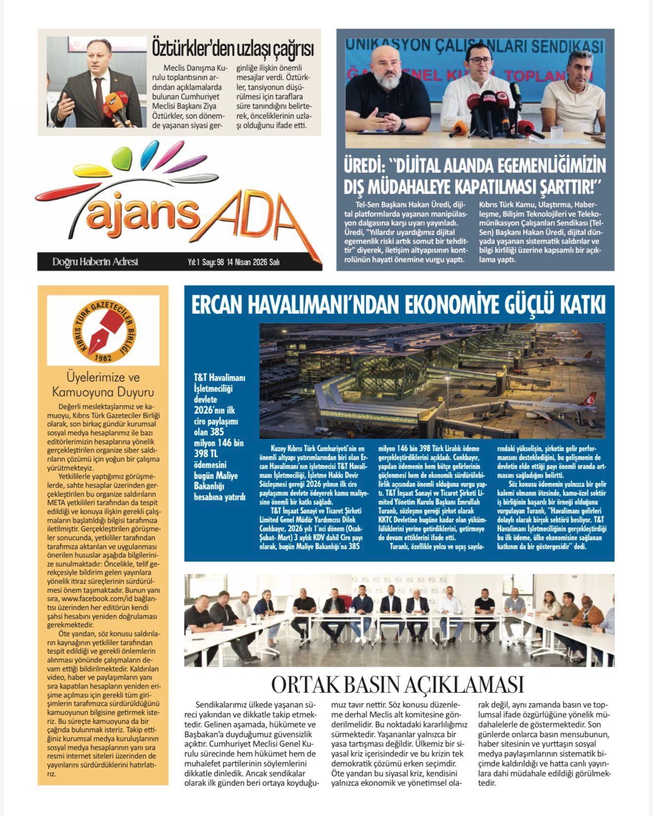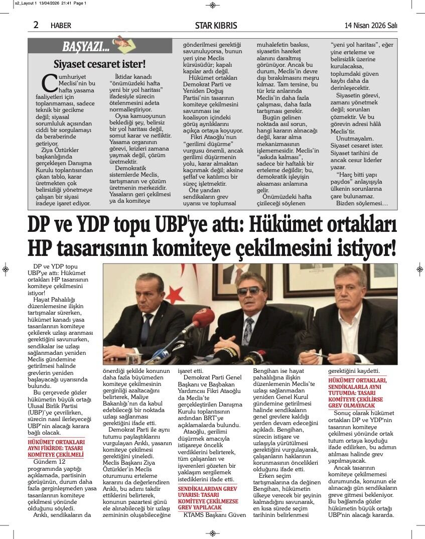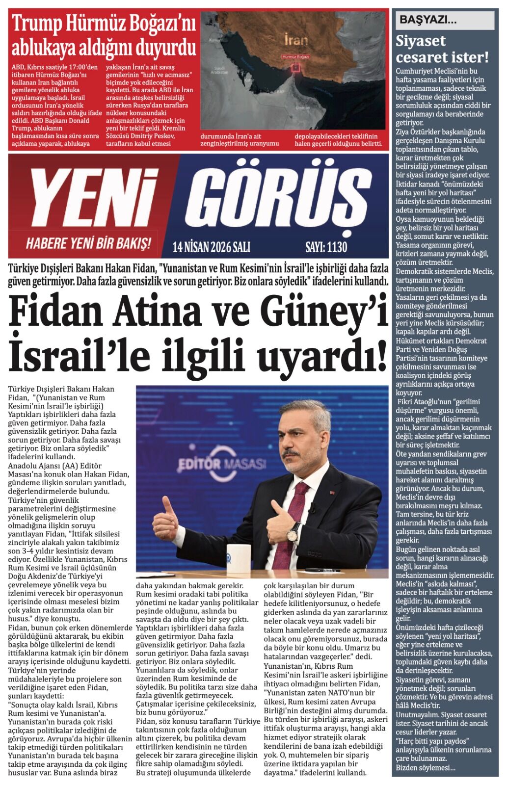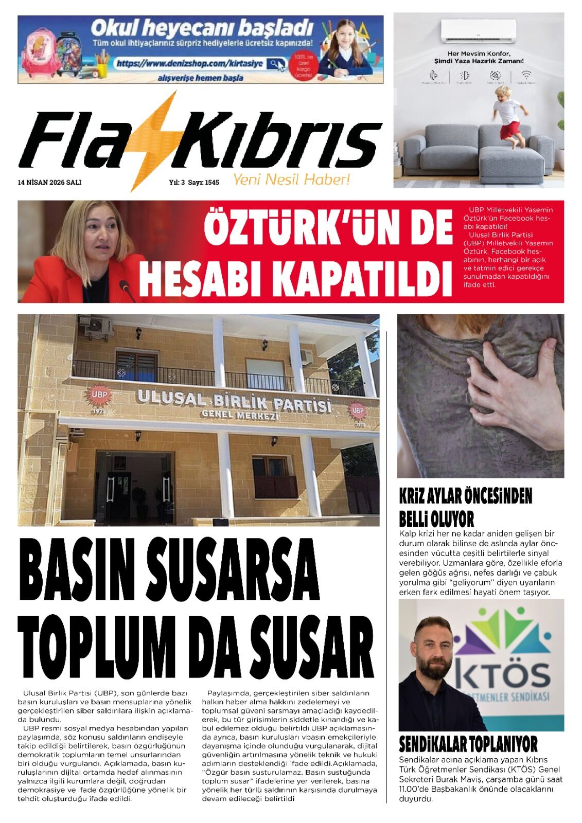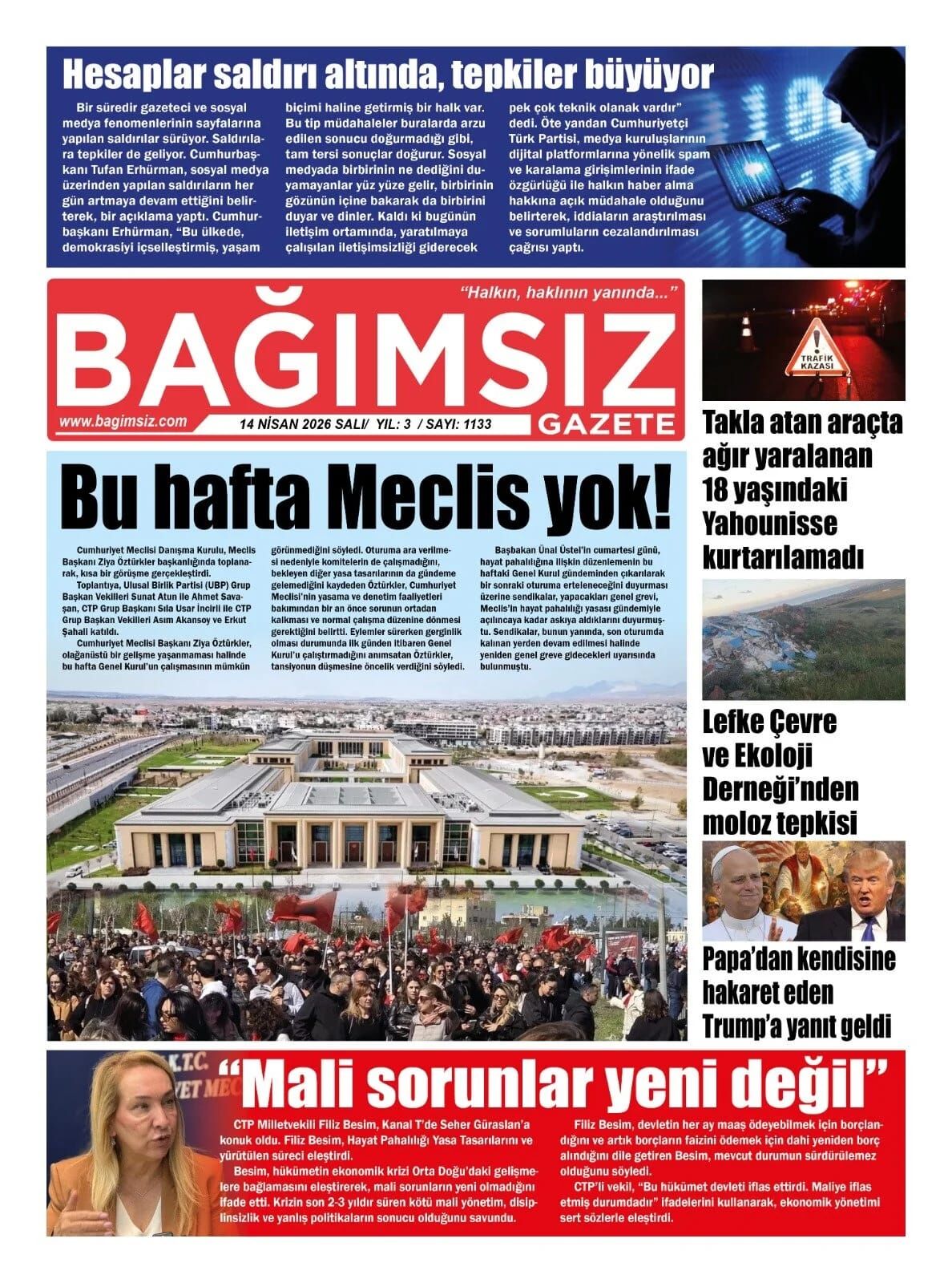 KıbrısGAZETE MANŞETLERİ (14 NİSAN 2026)Nisan 14, 2026 8:10 am PaylaşEtiketlendi:Kibris dakik KKTC gazeteleri manşetleri İlgili haberler GÜLBAHAR: ERHÜRMAN NET TAVIR KOYMALI Nisan 14, 2026 DÖVİZ KURLARI (14 NİSAN 2026) Nisan 14, 2026 HULUSİ AKAR'DAN SERT TEPKİ Nisan 14, 2026 Cevap bırakın Yanıtı iptal etE-posta adresiniz yayınlanmayacak. Gerekli alanlar * ile işaretlenmişlerdirYorumAd * E-posta * İnternet sitesi Daha sonraki yorumlarımda kullanılması için adım, e-posta adresim ve site adresim bu tarayıcıya kaydedilsin.