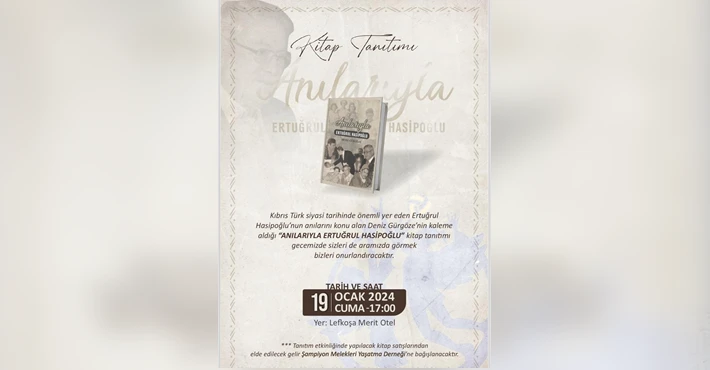 Kıbrıs Türk siyasi tarihinde önemli yer eden Ertuğrul Hasipoğlu’nun anılarını konu alan Deniz Gürgöze’nin kaleme aldığı ‘ANILARIYLA ERTUĞRUL HASİPOĞLU’ kitap tanıtımı 19 Ocak Cuma günü Lefkoşa Merit Otelde gerçekleşecek.Tanıtım etkinliğinde yapılacak kitap satışlarından elde edilecek gelir Şampiyon Melekleri Yaşatma Derneği’ne bağışlanacak.