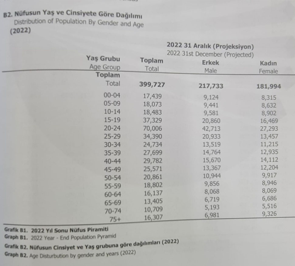 Yapılan projeksiyon çalışmasına göre, KKTC nüfusunun 2022 yılında 399 bin 727 olarak kayıtlara geçtiği bildirildi.