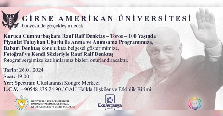GAÜ’den  verilen bilgiye göre; 26 Ocak 2024 Cuma günü saat 19.00’da Sprectrum Uluslararası Kongre Merkezinde sunumu yapılacak olan programa, repertuvarı ile Piyanist Tuluyhan Ugurlu katılım göstererek dinleyicilerle buluşacak. İletişim Fakültesi Ögretim Üyesi Yrd. Doç. Dr. Muharrem Özdemir’in yapımcılığını ve yönetmenliğini  üstlendiği “Babam Denktaş” adlı kısa belgesel ile Mine-Cem Kar çiftinin hazırladığı ‘Fotoğraf ve Kendi Sözleri ile Rauf Raif Denktaş’ konulu fotoğraf sergisinin de yer alacağı anma programı; bundan yüz yıl önce, 27 Ocak 2024 tarihinde Baf kazasında doğan Merhum Kurucu Cumhurbaşkanı Rauf Raif Denktaş adına, bu anlamda düzenlenmiş ilk etkinlik olma özelliğini de taşıyor.