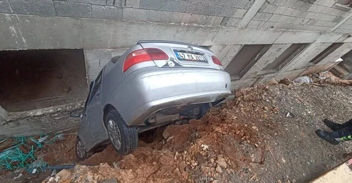 Mardin’in Artuklu ilçesinde sürücüsünün kontrolünü yitirdiği plakalı otomobil, inşaat halindeki bina ile istinat duvarı arasında, yaklaşık 2 metre genişliğindeki boşluğa düştü.