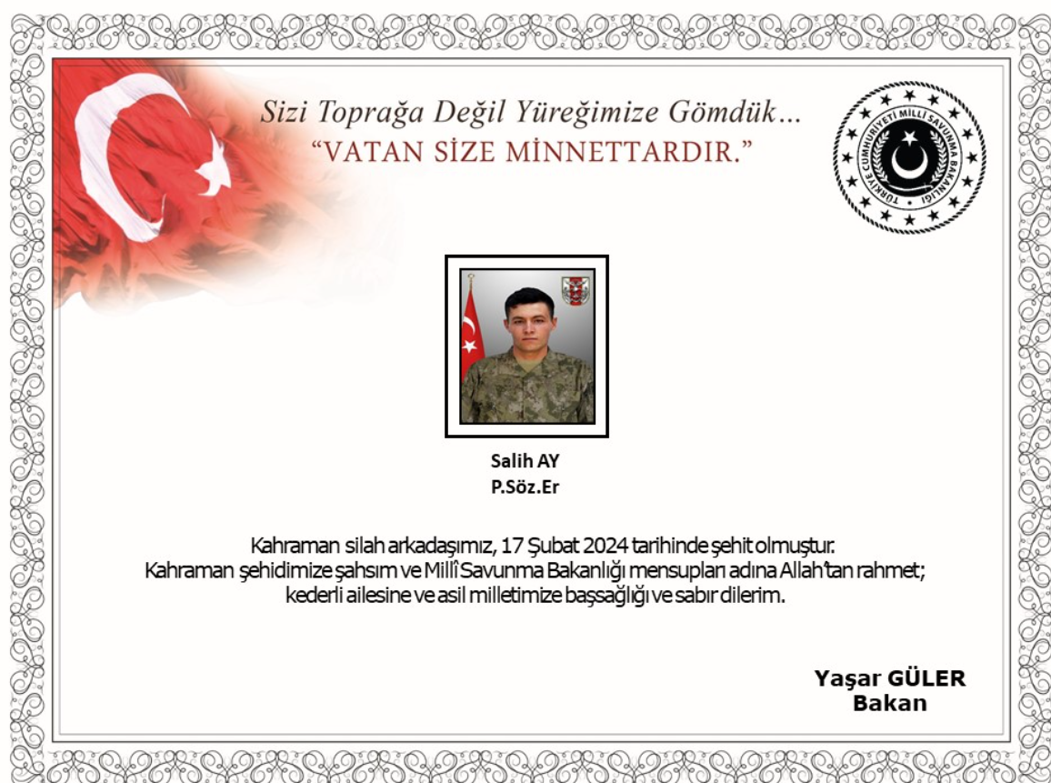 Milli Savunma Bakanlığından yapılan açıklamada, “Pençe-Kilit Operasyonu Bölgesinde, 17 Şubat 2024 tarihinde, BTÖ mensuplarınca bir üs bölgemize sızma girişiminde bulunulmuş, çıkan çatışmada kahraman silah arkadaşımız Piyade Sözleşmeli Er Salih Ay şehit olmuş, bir kahraman silah arkadaşımız yaralanmıştır. Yaralanan personelimiz, derhal hastaneye sevk edilerek tedavisine başlanmıştır” ifadelerine yer verildi.