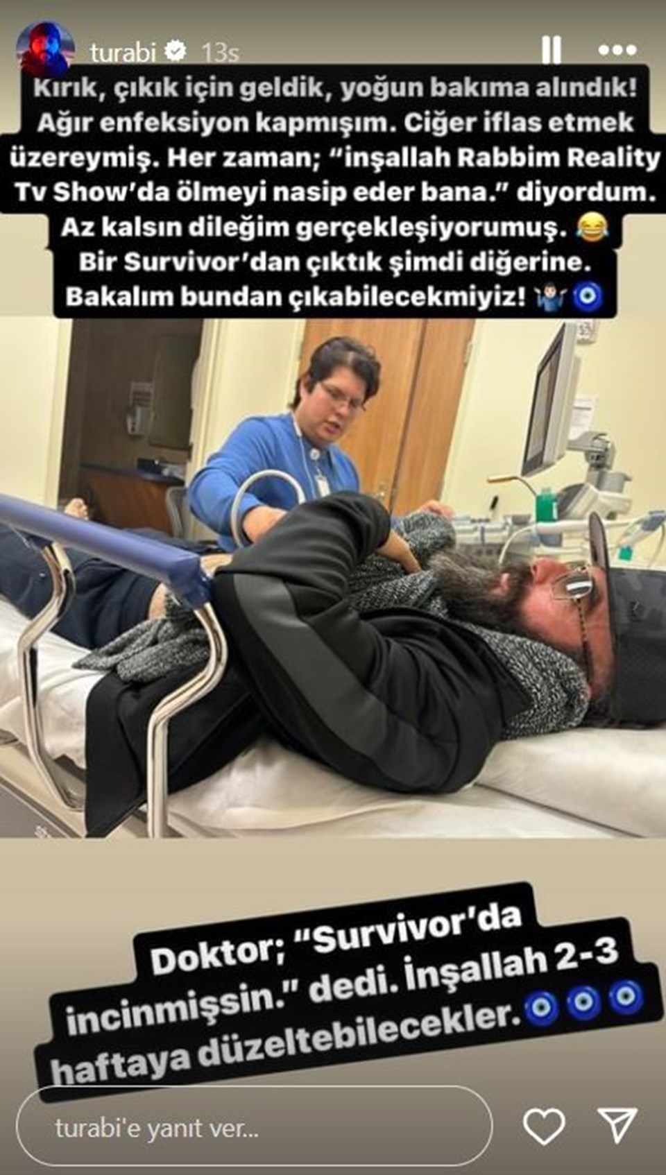 Hastane odasında çekilen bir fotoğrafını paylaşan Turabi, ‘’Kırık çıkık için geldik, yoğun bakıma alındık. Ağır enfeksiyon kapmışım. Ciğer iflas etmek üzereymiş.’’ ifadelerini kullandı.