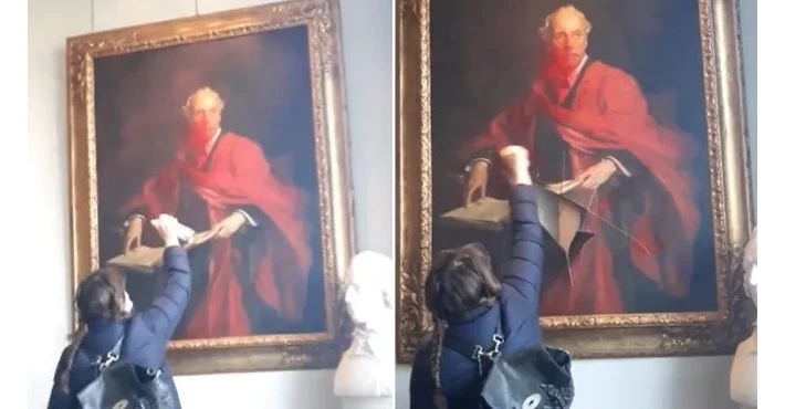 Cambridge Üniversitesi’ne bağlı Trinity College’ta sergilenen Lord Arthur James Balfour’un portresi tahrip edildi. Filistin yanlısı “Palestine Action” grubuna bağlı bir aktivist, önce tabloyu kırmızıya boyadı. Ardından maket bıçağıyla kesti.