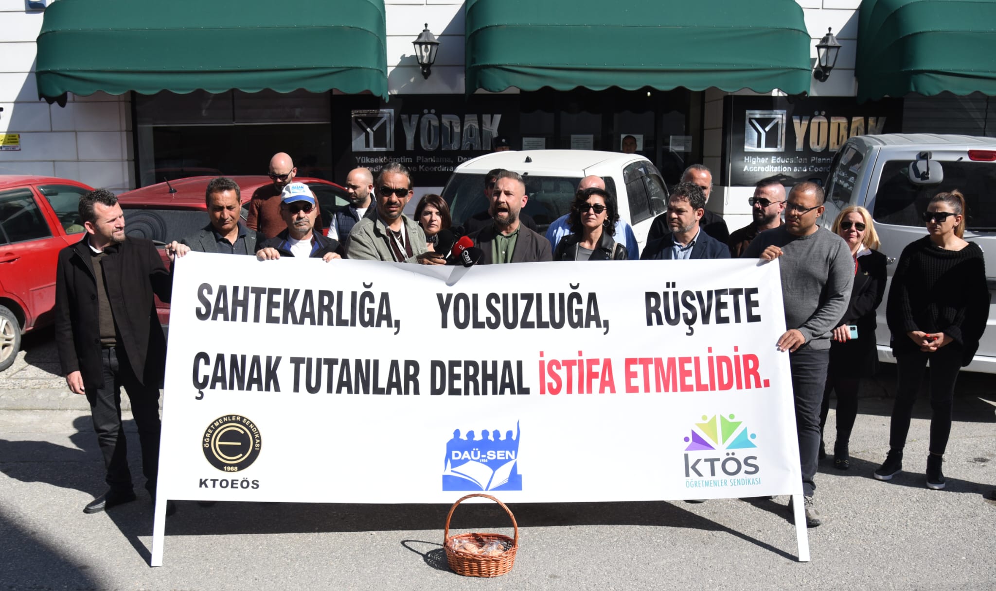Kıbrıs Türk Öğretmenler Sendikası, Kıbrıs Türk Orta Eğitim Öğretmenler Sendikası ve Doğu Akdeniz Üniversitesi Akademik Personel Sendikası Yükseköğretim Planlama, Denetleme, Akreditasyon ve Koordinasyon Kurulu önünde eylem yaptı.
