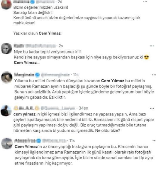 5,7 milyon takipçisinin bulunduğu Instagram hesabını aktif olarak kullanan ve sık sık gündelik hayatından kareleri paylaşan Cem Yılmaz, sahura kalkılan ilk günde içtiği içkinin fotoğrafını yayınladı. Paylaşımından dolayı eleştirilerin hedefi olan Yılmaz, X’te gündem oldu. Yılmaz için “Nispet yapar gibi böyle bir paylaşım yapması doğru değil” ve “Kendisine saygısı olmayanın başkasına da olmaz” yorumları yapıldı. Ünlü komedyen ise eleştirilere sessiz kaldı.
