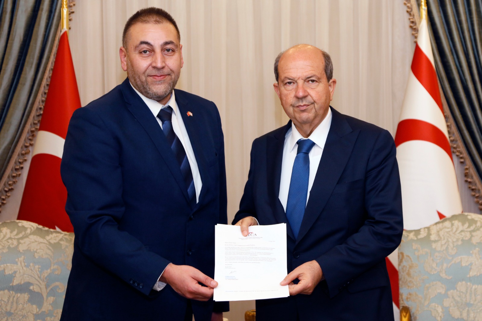 Cumhurbaşkanı Ersin Tatar, İngiltere Kıbrıs Türk Dernekleri Konseyi (CTCA) Başkanı Kenan Nafi ve Başkan Yardımcısı Halil İzzet’i kabul ederek görüştü.