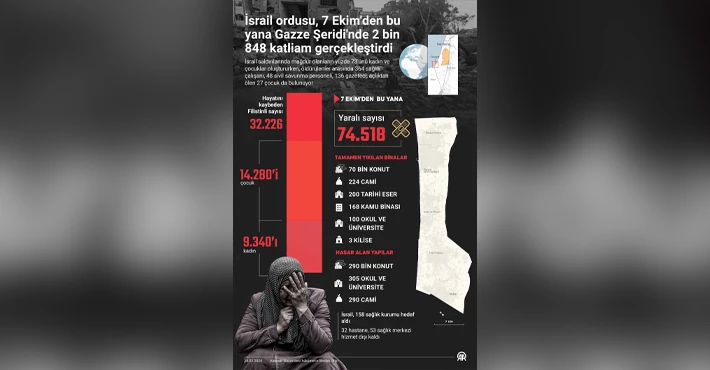 Medya Ofisinin verilerine göre, İsrail ordusu, 7 Ekim’den bu yana Gazze Şeridi’nde savunmasız Filistin halkına, sivillere, çocuklara ve kadınlara yönelik 2 bin 848 katliam gerçekleştirdi.