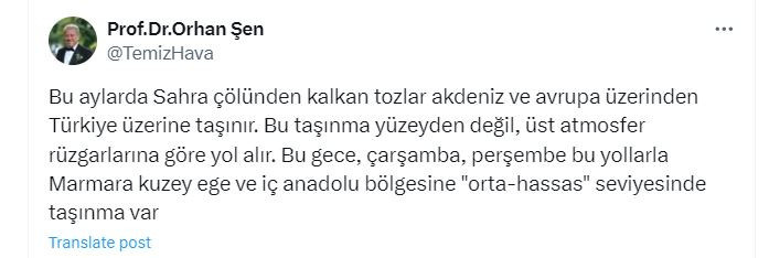“Bu aylarda Sahra çölünden kalkan tozlar akdeniz ve avrupa üzerinden Türkiye üzerine taşınır. Bu taşınma yüzeyden değil, üst atmosfer rüzgarlarına göre yol alır. Bu gece, çarşamba, perşembe bu yollarla Marmara kuzey ege ve iç anadolu bölgesine “orta-hassas” seviyesinde taşınma var”