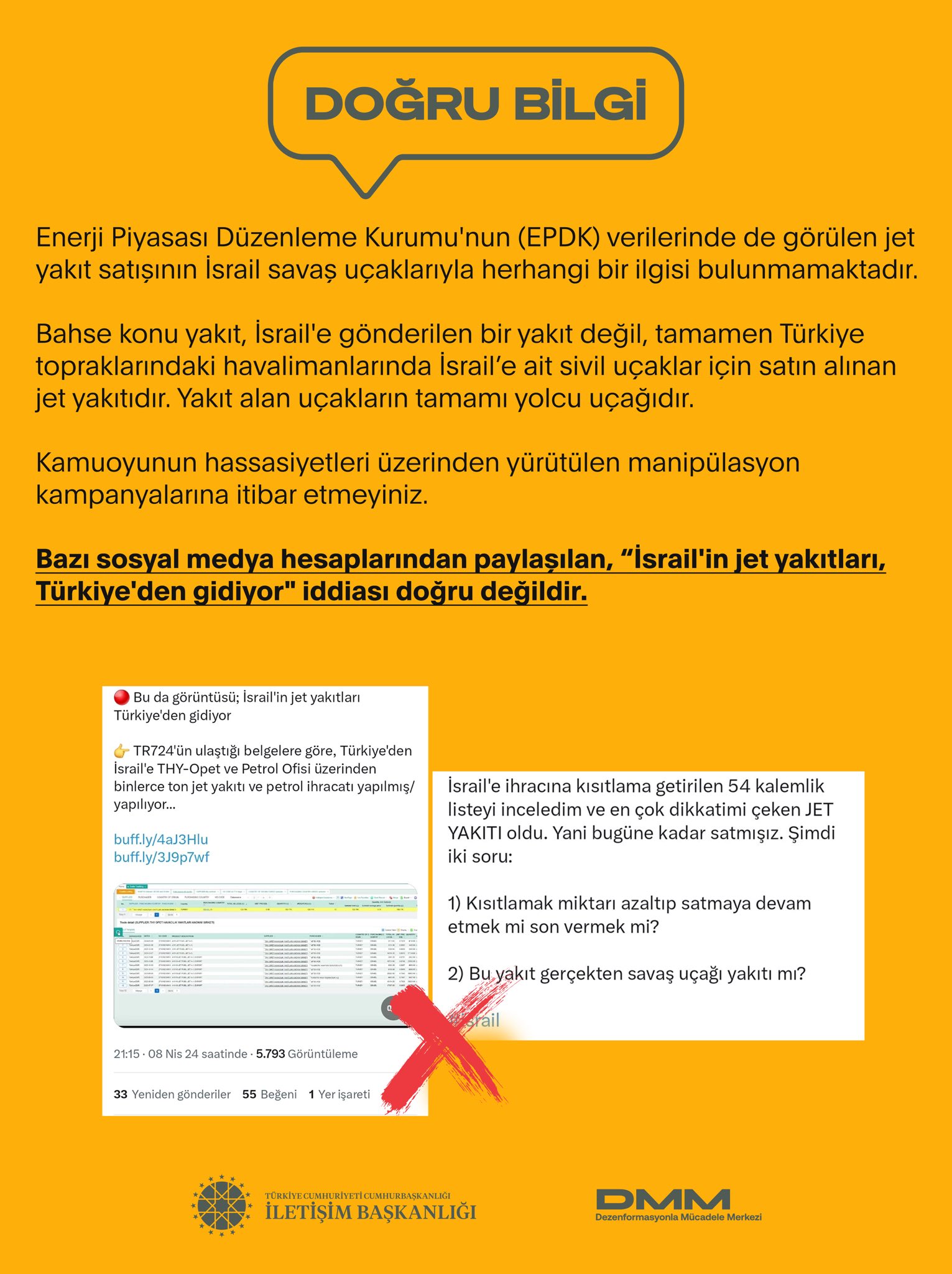 İletişim Başkanlığı Dezenformasyonla Mücadele Merkezi “İsrail’in jet yakıtları, Türkiye’den gidiyor” iddiasıyla ilgili açıklama yaptı. DMM, söz konusu yakıtların ülke topraklarındaki İsrail’e ait sivil uçaklar için satın alındığını paylaştı.