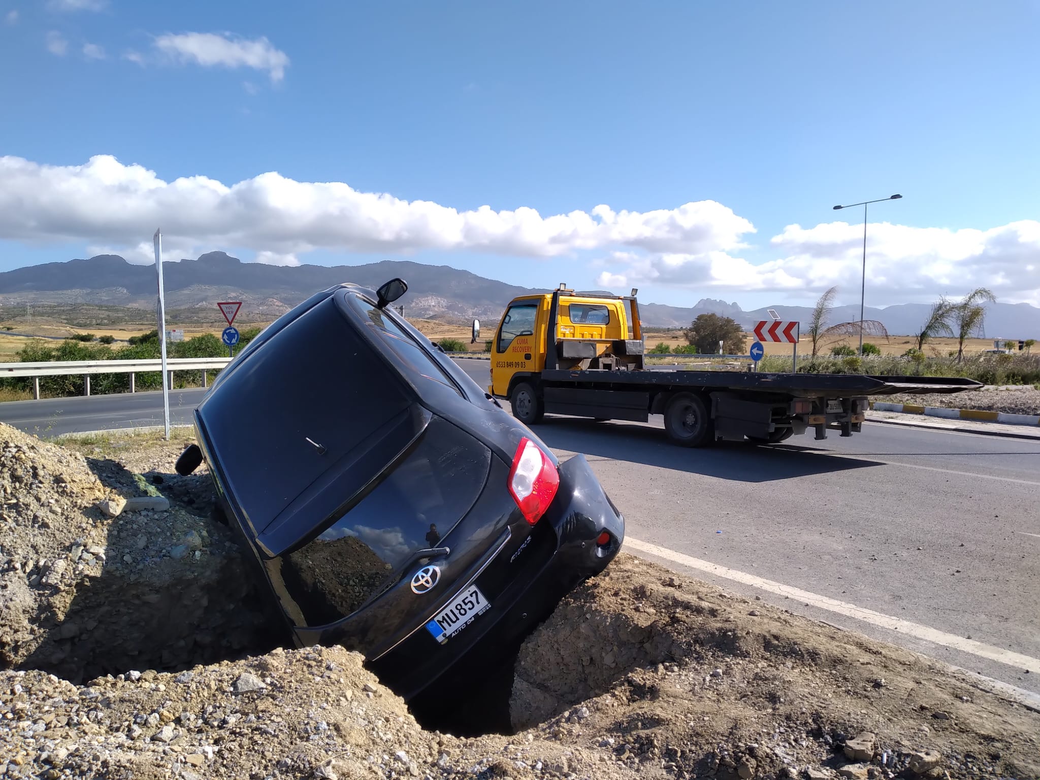 Lefkoşa-Gazimağusa ana yolunda yoldan çıkıp refüje çarpan araç Halkbank çemberindeki çukura düştü. Kazada yaralanan olmadı.