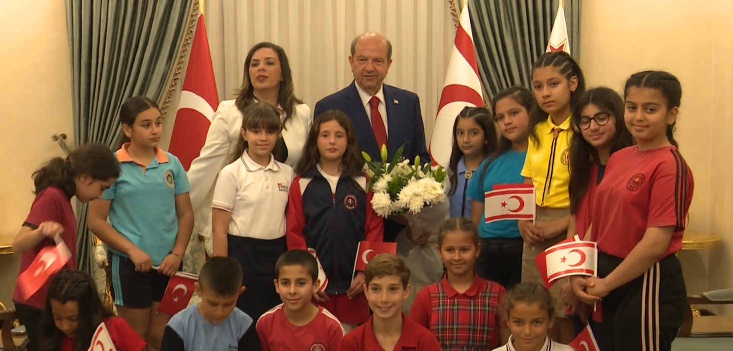 Cumhurbaşkanı Ersin Tatar kutlamalar çerçevesinde, 6 ilçeden gelen 15 öğrenciyi kabul etti.