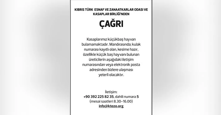 KTEZO’dan yapılan açıklamada, mandırasında, kulak numarası kayıtlı olan, kesime hazır, özellikle küçükbaş hayvanı bulunan üreticilerin, mesai saatleri olan 8.30-16.30 saatleri arasında +903922258235 (dahili numara 5) iletişim numarasından veya info@ktezo.org elektronik posta adresinden kendilerine ulaşabilecekleri duyuruldu.