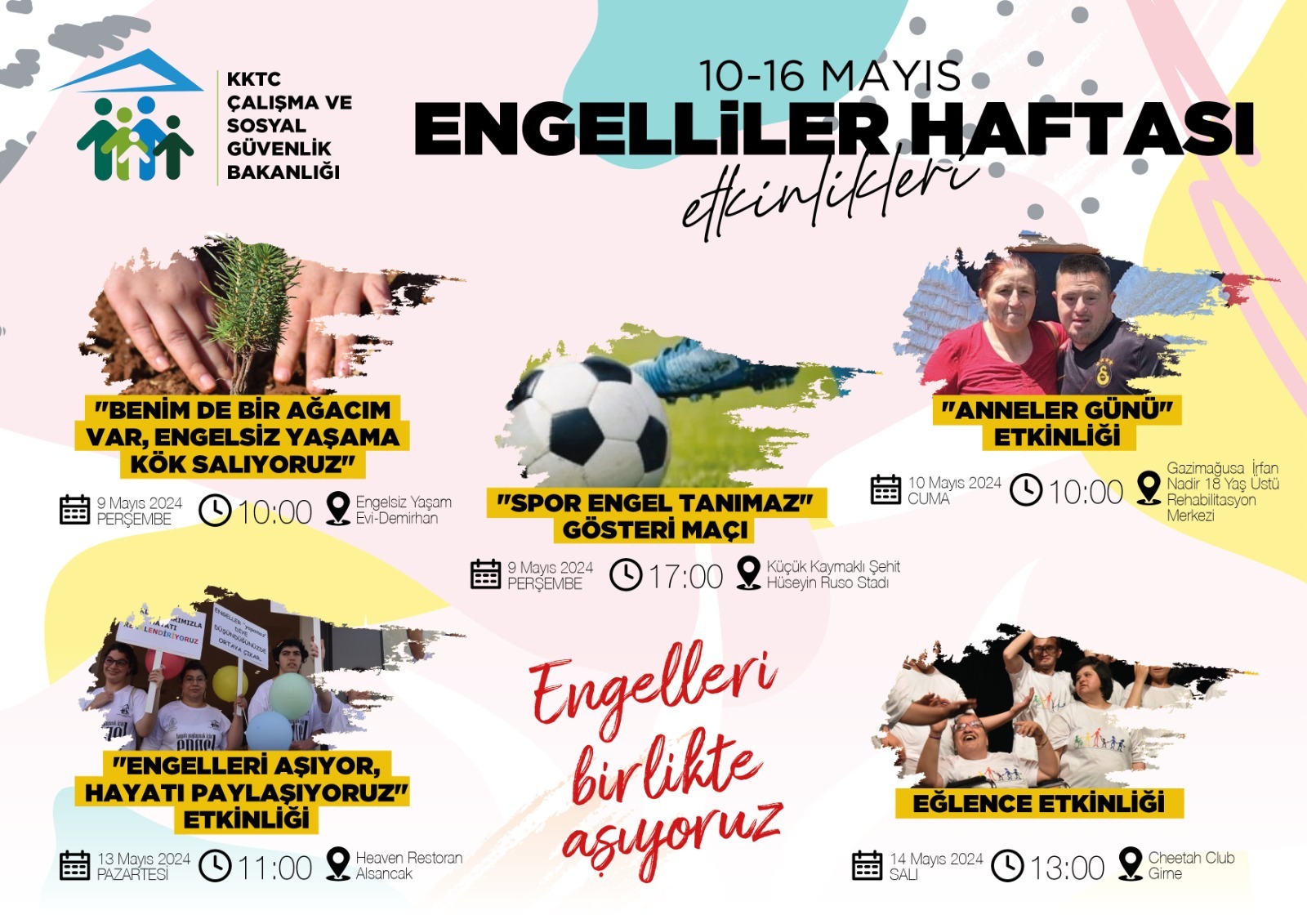 10 Mayıs Cuma günü saat 10.00’da Mağusa İrfan Nadir 18 Yaş Üstü Rehabilitasyon Merkezi’ndeki özel gereksinimli gençler tarafından “Anneler Günü” etkinliği, 13 Mayıs Pazartesi günü saat 11.00’de Alsancak Heaven Restoran’da, Mare Monte Kadınlar Derneği iş birliğinde “Engelleri Aşıyor, Hayatı Paylaşıyoruz” etkinliği ve 14 Mayıs Salı günü saat 13.00’de Cheetah Club’da özel gereksinimli gençlere yönelik danslı eğlence etkinliği yapılacak.