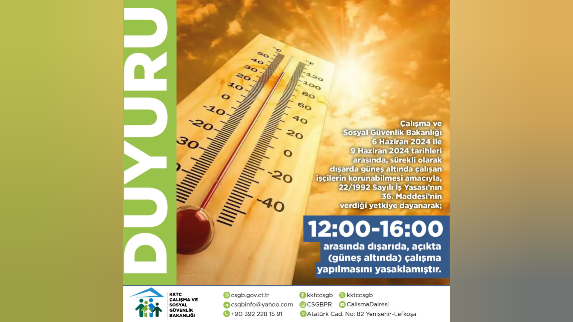 Buna göre, 6 – 9 Haziran tarihleri arasında sürekli olarak dışarda güneş altında çalışan işçilerin korunabilmesi amacıyla “22/1992 Sayılı İş Yasasının 36. Maddesi”nin Çalışma ve Sosyal Güvenlik Bakanlığı’na verdiği yetkiye dayanarak, saat 12.00 ile 16.00 arasında dışarıda, açıkta, güneş altında çalışma yapılmasını yasaklayan bakanlık, şunları kaydetti: