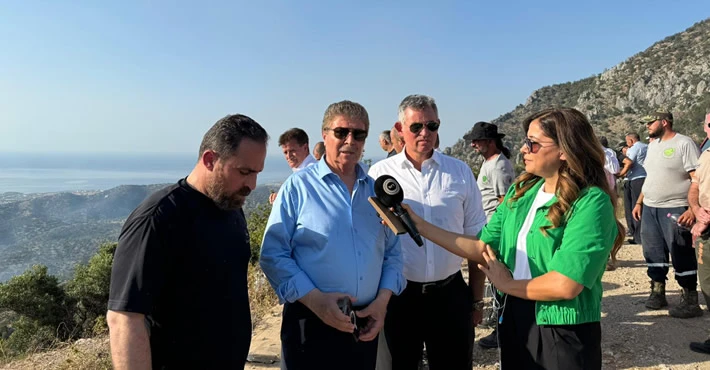 Başbakan Ünal Üstel, TC Lefkoşa Büyükelçisi Metin Feyzioğlu, Bayındırlık ve Ulaştırma Bakanı Erhan Arıklı, Tarım ve Doğal Kaynaklar Bakanı Hüseyin Çavuş ve diğer yetkililer yangın söndürme çalışmalarını yerinde izliyor.