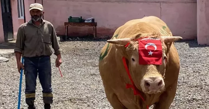 Kars merkeze bağlı Kümbetli köyünde besicilik yapan Erol Çolak, 2 yıl önce besiye aldığı ve ‘Şahmurat” ismini verdiği Fransız Şarole ırkı boğayı, Kurban Bayramı için satışa çıkardı. 2 yıl süreyle özenle bakılan ve 1 ton 150 kilograma ulaşan boğayı iş insanı Kenan Kılıç, 300 bin lira ödeyerek aldı. Boğayı 2 yıldır özenle beslediğini söyleyen besici Çolak, günlük 30 kilogram yem tükettiğini kaydetti.