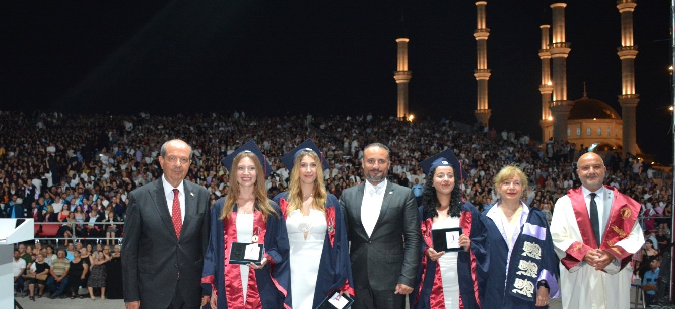 Konuşmaların ardından diploma töreni Cumhurbaşkanı Ersin Tatar, Prof. Dr. İrfan Suat Günsel ve Prof. Dr. Tamer Şanlıdağ’ın fakülte dekanları ile birlikte fakültelerini derece ile bitiren mezunlara madalyalarını takdim etmesiyle devam etti.