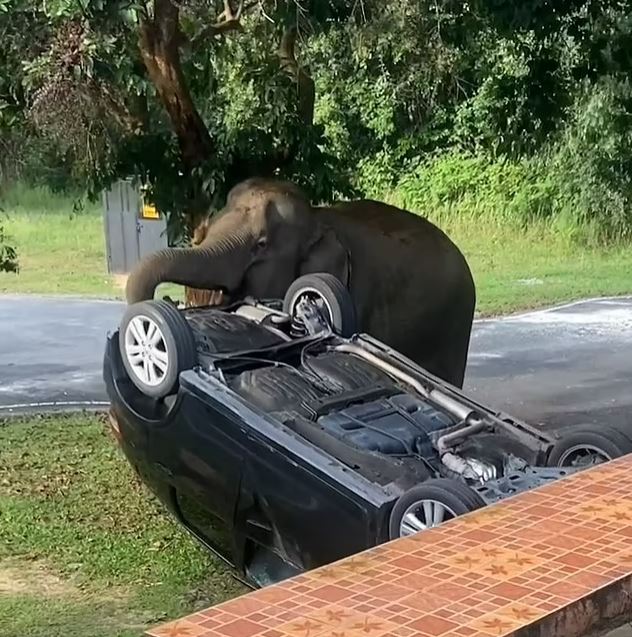 Güvenlik kamerası görüntülerinde, üç yetişkin ve iki yavru filin yiyecek aradığı görülüyor. Bir dişi fil, ailenin Honda marka aracına saldırarak önce yan çevirdi, sonra tamamen ters döndürdü.