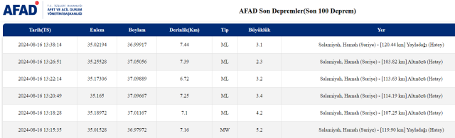Afad‘dan yapılan açıklamaya göre saat 13.15’te Suriye, Salamiyah, Hamah’ta 5.2 büyüklüğünde bir deprem oldu. Deprem, Hatay’ın Yayladağı ilçesine 119.90 km uzaklıkta meydana geldi. Depremin derinliği 7.16 km olarak açıklandı.