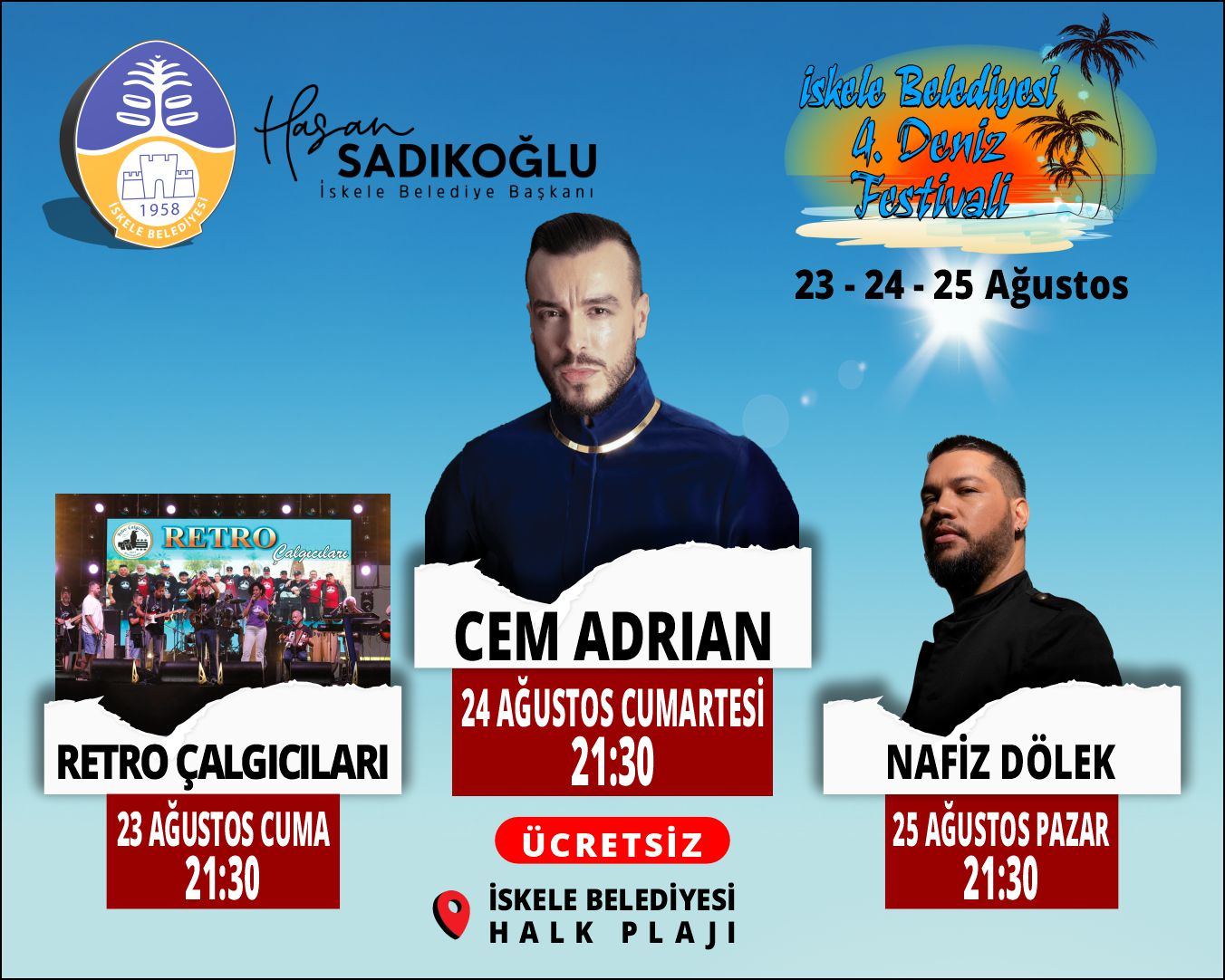 İskele Belediyesi Halk Plajı’nda düzenlenecek ve üç gün sürecek festivalde üç konser yer alacak. Çocuk Şenliği ile başlayacak 4. Deniz Festivali’nin açılış konserini Retro Çalgıcıları verecek. Festivalin ikinci gecesi Cem Adrian, kapanışında ise Nafiz Dölek sahne alacak. Saat 21.30’da İskele Belediyesi Halk Plajı’nda başlayacak konserlere ücretsiz giriş sağlanabilecek.