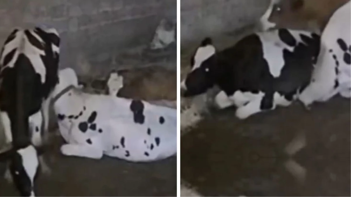 Sosyal medyada paylaşılan ilginç videolara bir yenisi daha eklendi. Bu kez görüntünün kaydedildiği yer bir çiftlik… Güvenlik kameraları tarafından saniye saniye kaydedilen olayda, yerde yatmakta olan ineğin nefessiz kalarak feci şekilde telef olduğu görülüyor.