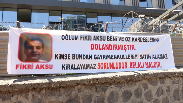 Ne zaman asıldığı bilinmeyen pankartta, “Oğlum F.A., beni ve öz kardeşlerini dolandırmıştır. Kimse bundan gayrimenkullerimi satın alamaz, kiralayamaz. Sorunludur, belalı maldır” ifadeleri yer aldı.