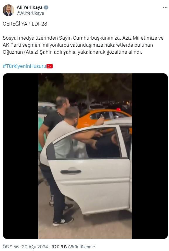 Konuya ilişkin sosyal medya hesabından açıklama yapan İçişleri Bakanı Ali Yerlikaya şunları söyledi: “Gereği yapıldı-28. Sosyal medya üzerinden Sayın Cumhurbaşkanımıza, Aziz Milletimize ve AK Parti seçmeni milyonlarca vatandaşımıza hakaretlerde bulunan Oğuzhan (Atsız) Şahin adlı şahıs, yakalanarak gözaltına alındı.”