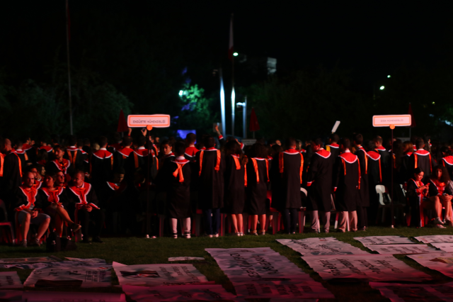 Orta Doğu Teknik Üniversitesi (ODTÜ) öğrencilerinin mezuniyet töreni Devrim Stadyumu’nda gerçekleştirildi. Kortej ve geleneksel mezun pankartlı yürüyüşten sonra havanın kararmasıyla pankartlar tribünlerden görünmedi. Öğrenciler ve yakınları “ışıkları aç” sloganları eşliğinde okul yönetimini protesto etti.