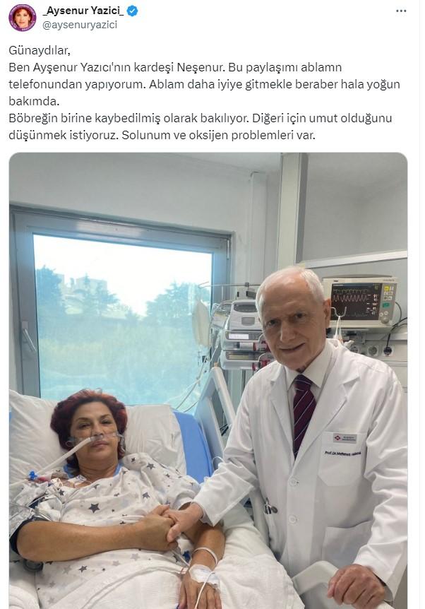 Yazıcı’nın sosyal medya hesabından paylaşım yapan kız kardeşi Neşenur Hanım, “Ben Ayşenur Yazıcı’nın kardeşi Neşenur. Bu paylaşımı ablamın telefonundan yapıyorum. Ablam daha iyiye gitmekle beraber hala yoğun bakımda. Böbreğin birine kaybedilmiş olarak bakılıyor. Diğeri için umut olduğunu düşünmek istiyoruz. Solunum ve oksijen problemleri var” ifadelerini kullandı. Gelen dualar için de teşekkür eden Neşenur Hanım “İyi dilekleriniz ve dualarınız için çok teşekkür ediyoruz. Dualara lütfen devam edin. Buradaki sorulara geri dönemeyeceğin anlayışla karşılayacağınızı umuyorum” dedi.