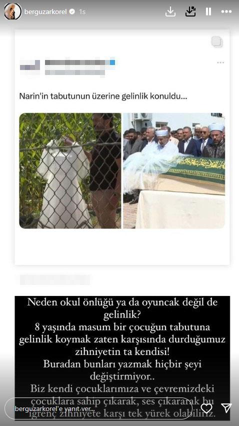 “Çocuk istismarının büyük bir kısmını da çocuk yaşta evlendirilirken kız çocukları oluşturuyor maalesef. 8 yaşında kız çocuğunun tabutunda gelinlik ne alaka? Zaten anne Narin aranırken bile ‘Geşinlik giyecekti! diye ağlıyor. Ne değişik kafalar yaşıyorsunuz siz ya. Sizde bir canlı hiç çocuk olmadan kadına mı dönüşüyor? Gerçekten eğitimsizliğin gözü kör olsun ya.”