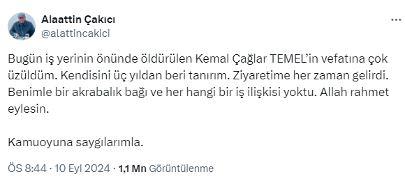 Konuyla ilgili bir açıklama yapan Çakıcı sosyal medya hesabından yaptığı paylaşımda “Bugün iş yerinin önünde öldürülen Kemal Çağlar Temel’in vefatına çok üzüldüm. Kendisini üç yıldan beri tanırım. Ziyaretime her zaman gelirdi. Benimle bir akrabalık bağı ve herhangi bir iş ilişkisi yoktu. Allah rahmet eylesin” ifadelerini kullandı.