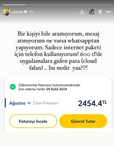Pucca olarak tanınan Selen Işık Pınar, Instagram hesabından 2454 TL’lik telefon faturasını yayınlayarak “Bir kişiyi bile aramıyorum, mesaj atmıyorum. Ne varsa Whatsapp’tan yapıyorum. Sadece internet paketi için telefon kullanıyorum. 600 TL de uygulamalara giden para. Bu nedir ya?” diyerek sitem etti.